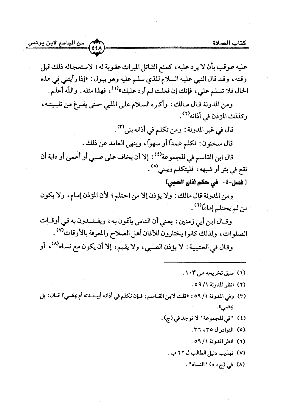 ومن المدونة قال مالك: ولا يؤذن إلا من احتلم؛ لأن المؤذن إمام، ولا يكون من لم يحتلم إمامًا.