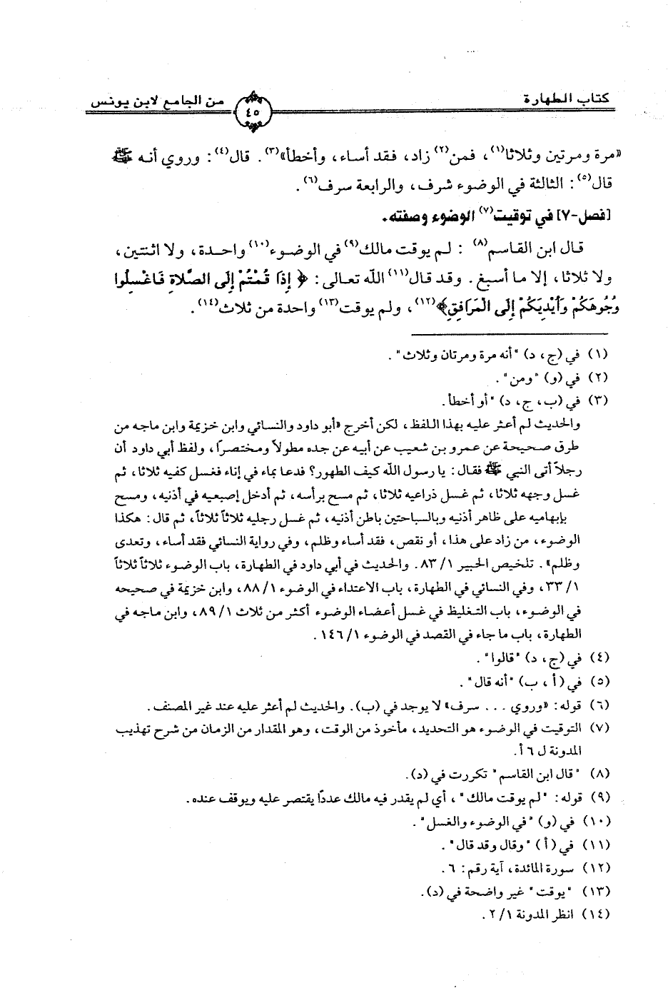 قال ابن القاسم: لم يوقت مالك في الوضوء واحدة، ولا اثنتين، ولا ثلاثا، إلا ما أسبغ. وقد قال الله تعالى: (إِذَا قُمْتُمْ إِلَى الصَّلَاةِ فَاغْسِلُوا وُجُوهَكُمْ وَأَيْدِيَكُمْ إِلَى الْمَرَافِقِ)، ولم يوقت واحدة من ثلاث.