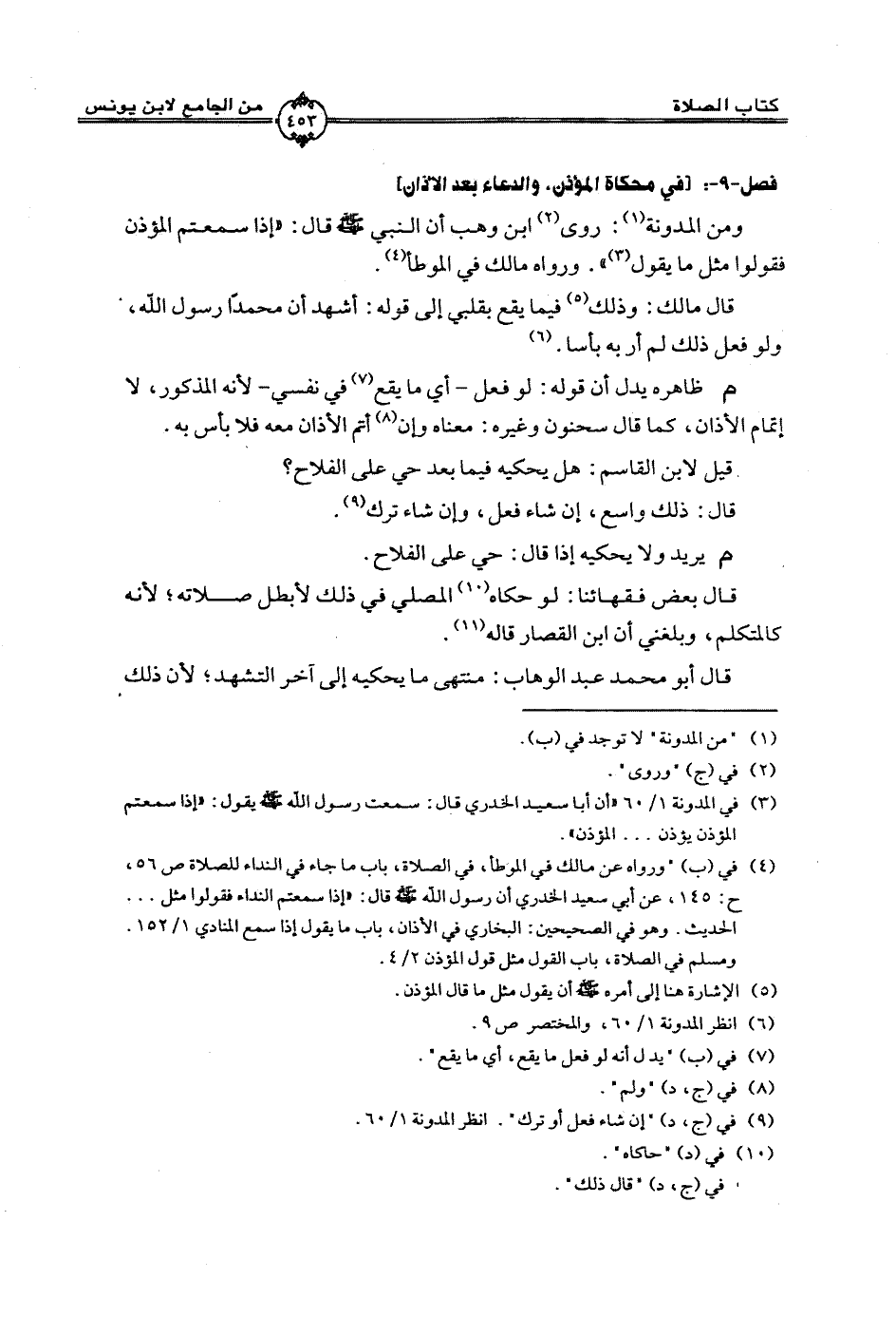 ومن المدونة: روى ابن وهب أن النبي صلى الله عليه وسلم قال: "إذا سمعتم المؤذن فقولوا مثل ما يقول ". ورواه مالك في الموطأ.