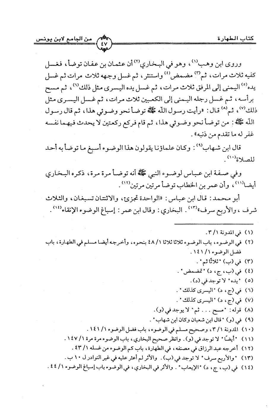 وروى ابن وهب، وهو في البخاري أن عثمان بن عفان توضأ، فغسل كفيه ثلاث مرات، ثم مضمض واستنشر، ثم غسل وجهه ثلاث مرات ثم غسل يده اليمني إلى المرفق ثلاث مرات، ثم غسل يده اليسري مثل ذلك، ثم مسح برأسه، ثم غسل رجله اليمنى إلى الكعبين ثلاث مرات، ثم غسل اليسرى مثل ذلك، ثم قال: ((رأيت رسول الله صلى الله عليه وسلم توضأ نحو وضوئي هذا، ثم قال رسول الله صلى الله عليه وسلم: من توضأ نحو وضوئي هذا، ثم قام فركع ركعتين لا يحدث نفسه غفر له ما تقدم من ذنبه)).