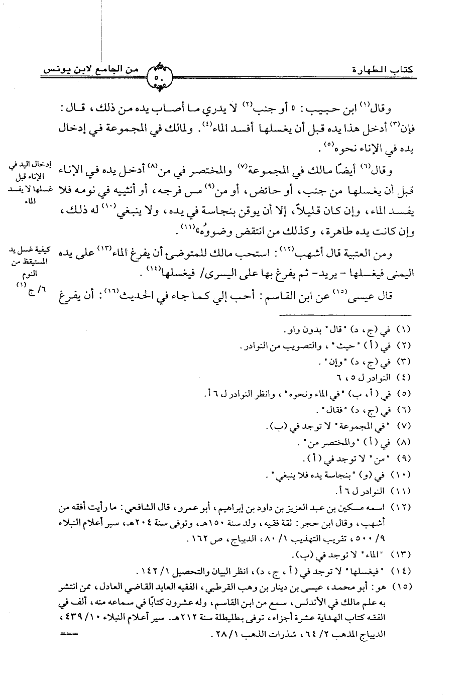 وقال ابن حبيب: ((أو جنب لا يدري ما أصاب يده من ذلك، قال: فإن أدخل هذا يده قبل أن يغسلها أفسد الماء. ولمالك في المجموعة في إدخال يده في الإناء نحوه.