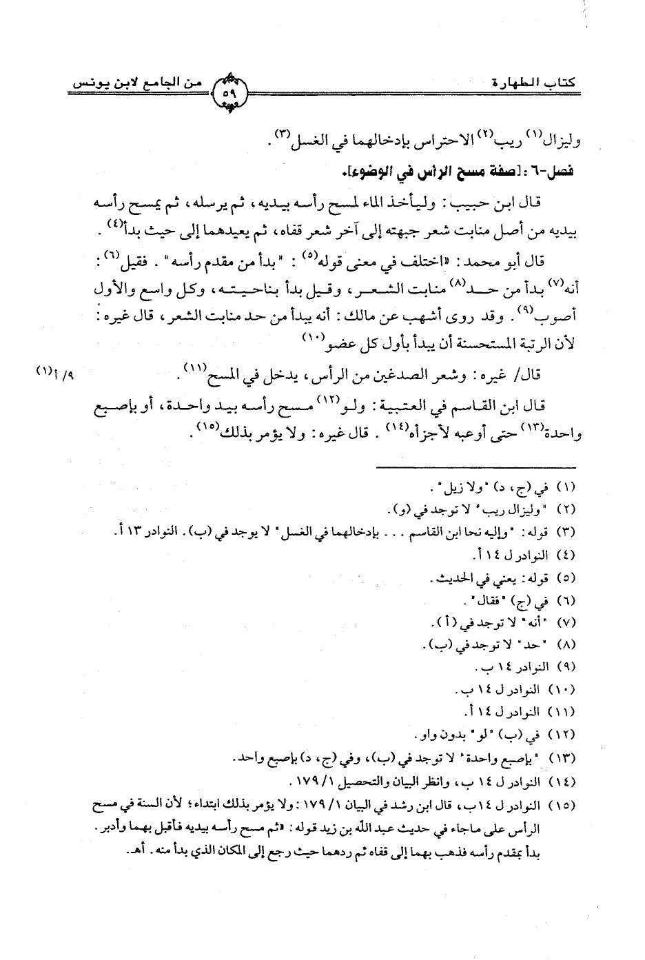 قال أبو محمد: "اختلف في معنى قوله: "بدأ من مقدم رأسه". فقيل أنه بدأ من حد منابت الشعر، وفيل بدأ بناحيته، وكل واسع والأول أصوب. وقد روى أشهب عن مالك: أنه يبدأ من حد منابت الشعر، قال غيره: لأن الرتبة المستحسنة أن يبدأ بأول كل عضو