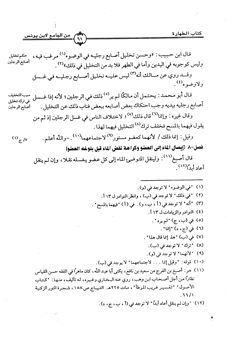 قال ابن حبيب: "وحسن تخليل أصابع رجليه في الوضوء مرغب فيه، وليس كوجوبه في اليدين وأما في الطهر فلا بد من التخليل في ذلك".