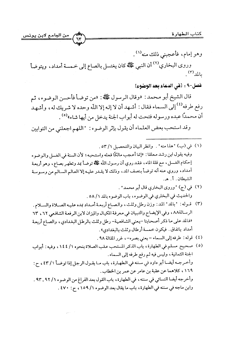 قال الشيخ أبو محمد:"وقال الرسول (ص): "من يتوضأ فأحسن الوضوء، ثم رفع طرفه إلى السماء فقال: أشهد أن لا إله إلا الله وحده لا شرك له، وأشهد أن محمدأ عبده ورسوله فتحت له أبواب الجنة يدخل من أيها شاء ".