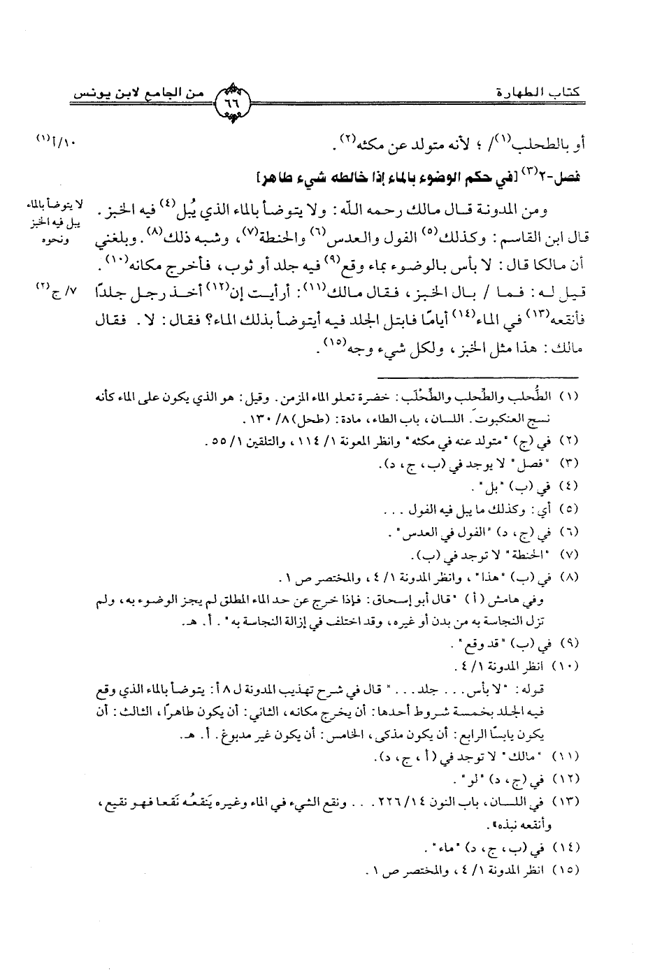 قيل له: فما / بال الخبز، فقال مالك: أرأيت إن أخذ رجل جلداً فأنقعه في الماء أياما فابتل الجلد فيه أيتوضأ بذلك الماء؟ فقال: لا. فقال مالك: هذا مثل الخبز، ولكل شيء وجه.