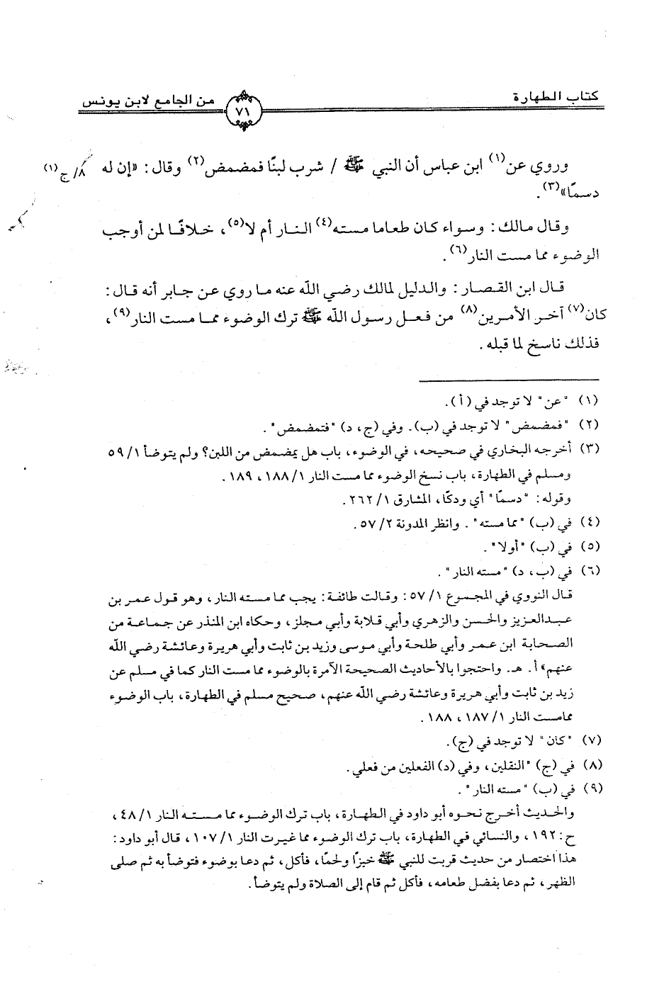 قال ابن القصار: والدليل لمالك رضي الله عنه ما روى عن جابر أنه قال: كان آخر الأمرين من فعل رسول الله - صلى الله عليه وسلم - ترك الوضوء مما مست النار، فذلك ناسخ لما قبله.