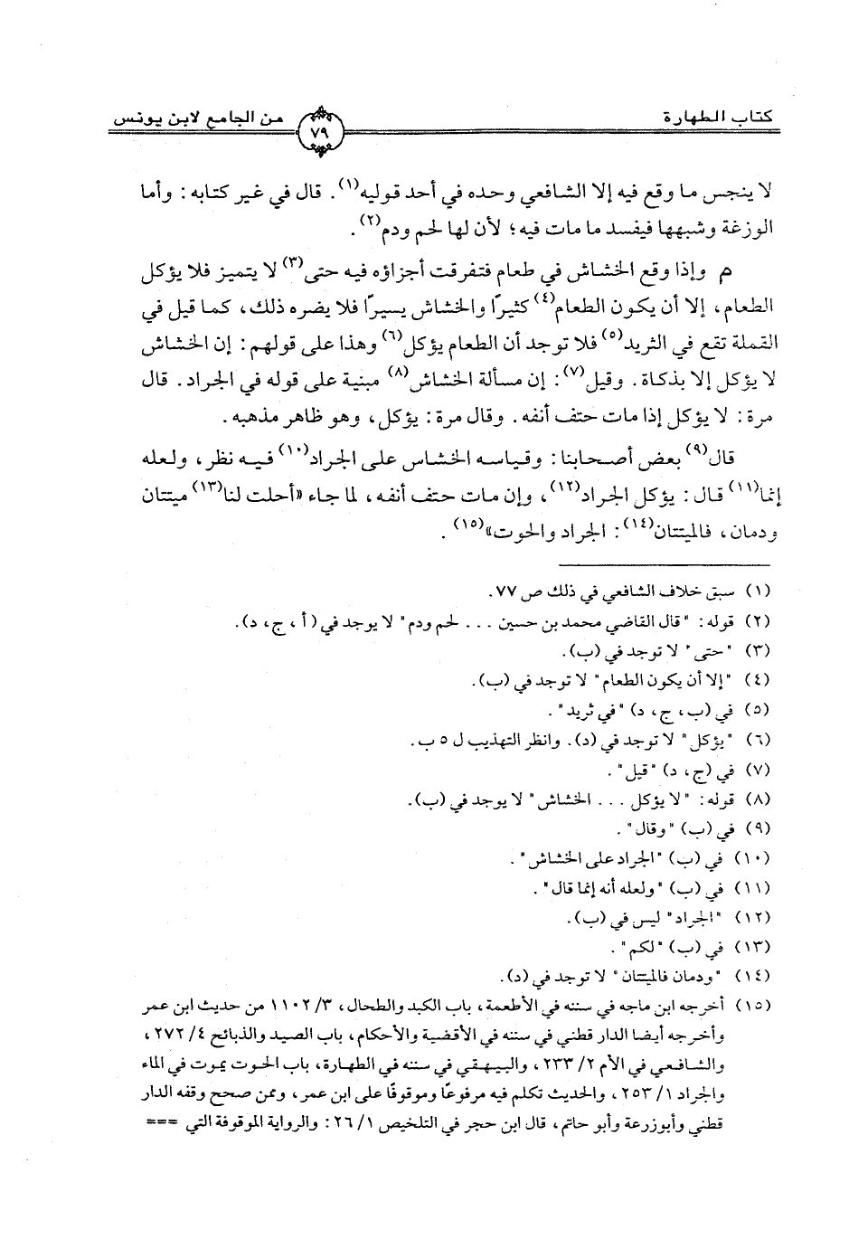 قال بعض أصحابنا: وقياسه الخشاش على الجراد فيه نظر، ولعله إنما قال: يؤكل الجراد، وإن مات حتف أنفه، لما جاء "أحلت لنا ميتتان ودمان، فالميتتان: الجراد والحوت".
