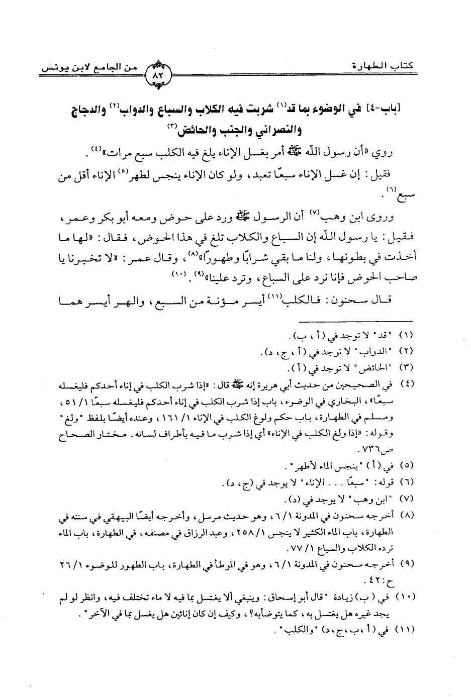 وروى ابن وهب أن الرسول صلى الله عليه وسلم ورد على حوش ومعه أبو بكر وعمر، فقيل: يا رسول الله إن السباع والكلاب تلغ في هذا الحوض، فقال: "لها ما أخذت في بطونها، ولنا ما بقي شراباً وطهوراً"، وقال عمر: " لا تخبرنا يا صاحب الحوض فإنا نرد على السباع، وترد علينا".