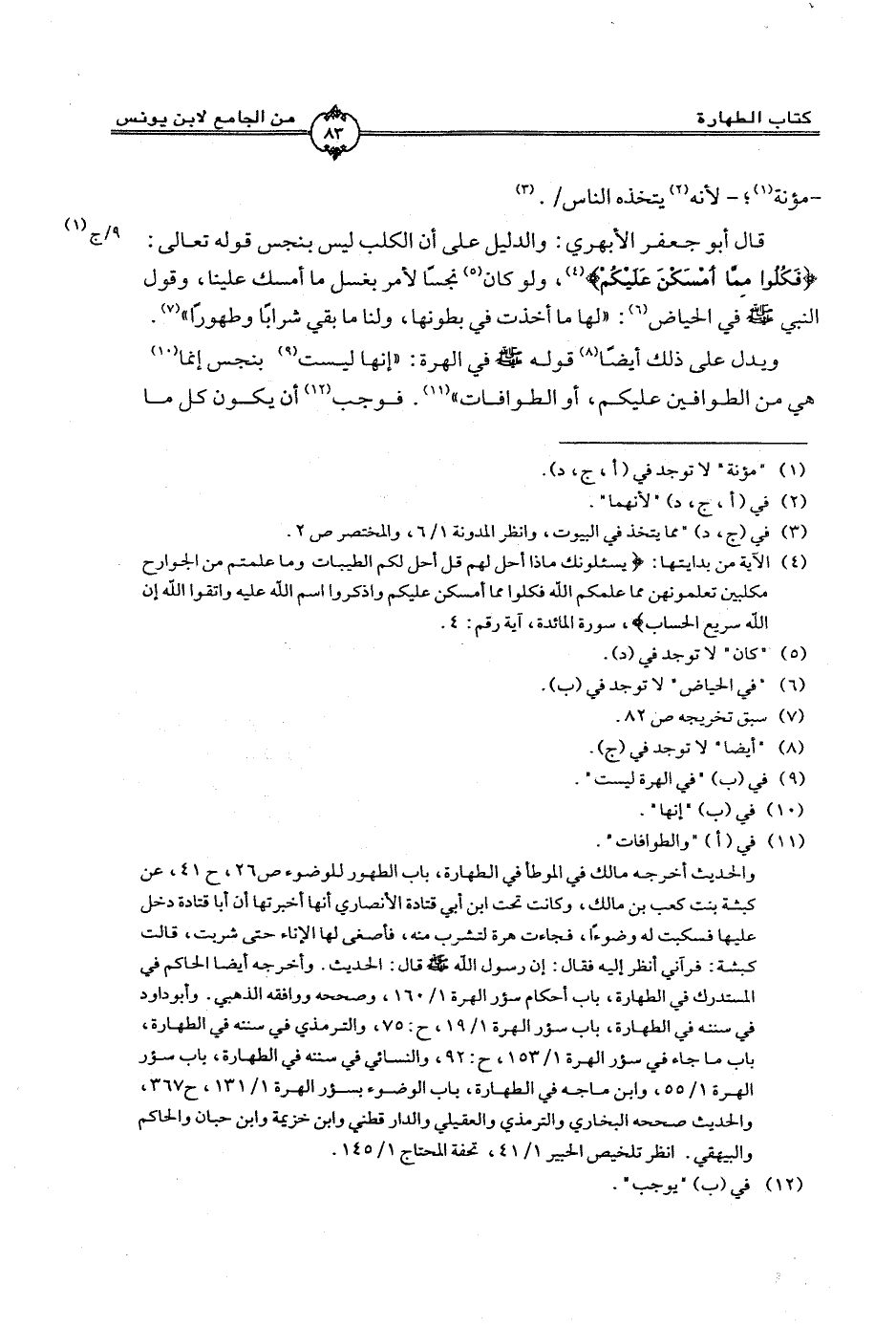 قال أبو جعفر الأبهري: والدليل على أن الكلب ليس بنجس قوله تعالى: (فَكُلُوا مِمَّا أَمْسَكْنَ عَلَيْكُمْ)، ولو كان نجساً لأمر بغسل ما أمسك علينا، وقول النبي (ص) في الحياض: "لها ما أخذت في بطونها، ولنا ما بقي شراباً وطهوراً".