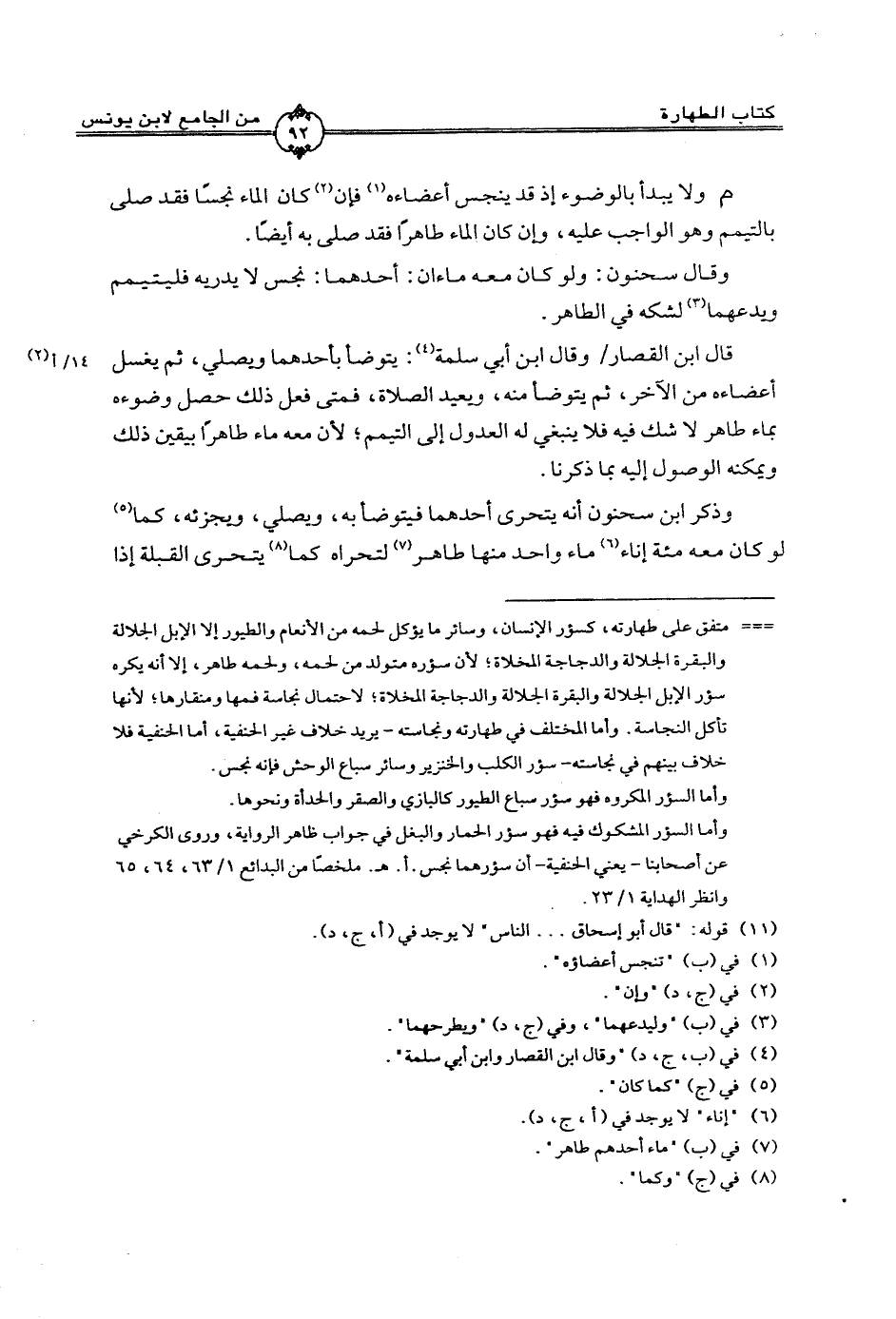 وقال سحنون: ولو كان معه ماءان: أحدهما: نجس لا يدريه فليتيمم ويدعهما لشكه في الطاهر.