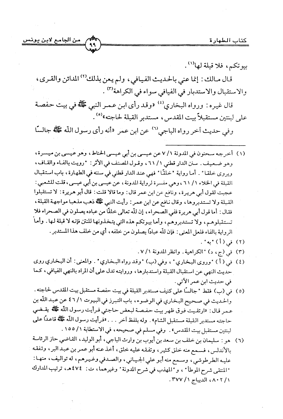قال غيره: ورواه البخاري ((وقد رأى ابن عمر النبي - صلى الله عليه وسلم - في بيت حفصة علي لبنتين مستقبلاً بيت المقدس, مستدبر القبلة لحاجته)).