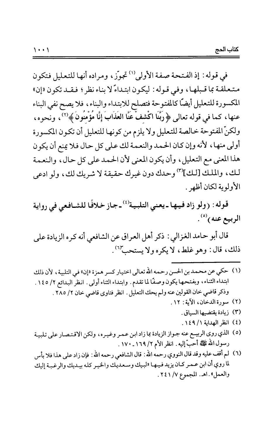 قوله: (ولو زاد فيها -يعني التلبية- جاز خلافًا للشافعي في رواية الربيع عنه).
