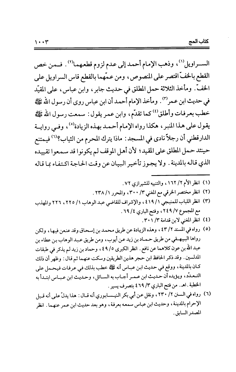 السراويل، وذهب الإمام أحمد إلى عدم لزوم قطعهما. فمن خص القطع بالخف اقتصر على المنصوص، ومن عمهما بالقطع قاس السراويل على الخف. ومأخذ الثلاثة حمل المطلق في حديث جابر، وابن عباس، على المقيد في حديث ابن عمر. ومأخذ الإمام أحمد أن ابن عباس روى أن رسول الله --صلى الله عليه وسلم-- خطب بعرفات وأطلق كما تقدم، وابن عمر يقول: سمعت رسول الله --صلى الله عليه وسلم-- يقول على هذا المنبر، هكذا رواه الإمام أحمد بهذه الزيادة، وفي رواية الدارقطني أن رجلاً نادى في المسجد: ماذا يترك المحرم من الثياب؟ فيمتنع حينئذ حمل المطلق على المقيد؛ لأن أهل الموقف لم يكونوا قد سمعوا تقييده الذي قاله بالمدينة. ولا يجوز تأخير البيان عن وقت الحاجة اكتفاء بما قاله