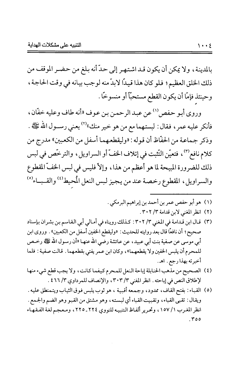 وروى أبو حفص عن عبد الرحمن بن عوف "أنه طاف وعليه خفان، فأنكر عليه عمر، فقال: لبستهما مع من هو خير منك" يعني رسول الله --صلى الله عليه وسلم--. وذكر جماعة من الحفاظ أن قوله: "وليقطعهما أسفل من الكعبين" مدرج من كلام نافع، فتعين التثبت في إتلاف الخف أو السراويل، والترخص في لبس ذلك للضرورة المبيحة لما هو أعظم من هذا، وإلا فليس في لبس الخف المقطوع والسراويل، المقطوع رخصة عند من يجيز لبس النعل المحيط والقباء
