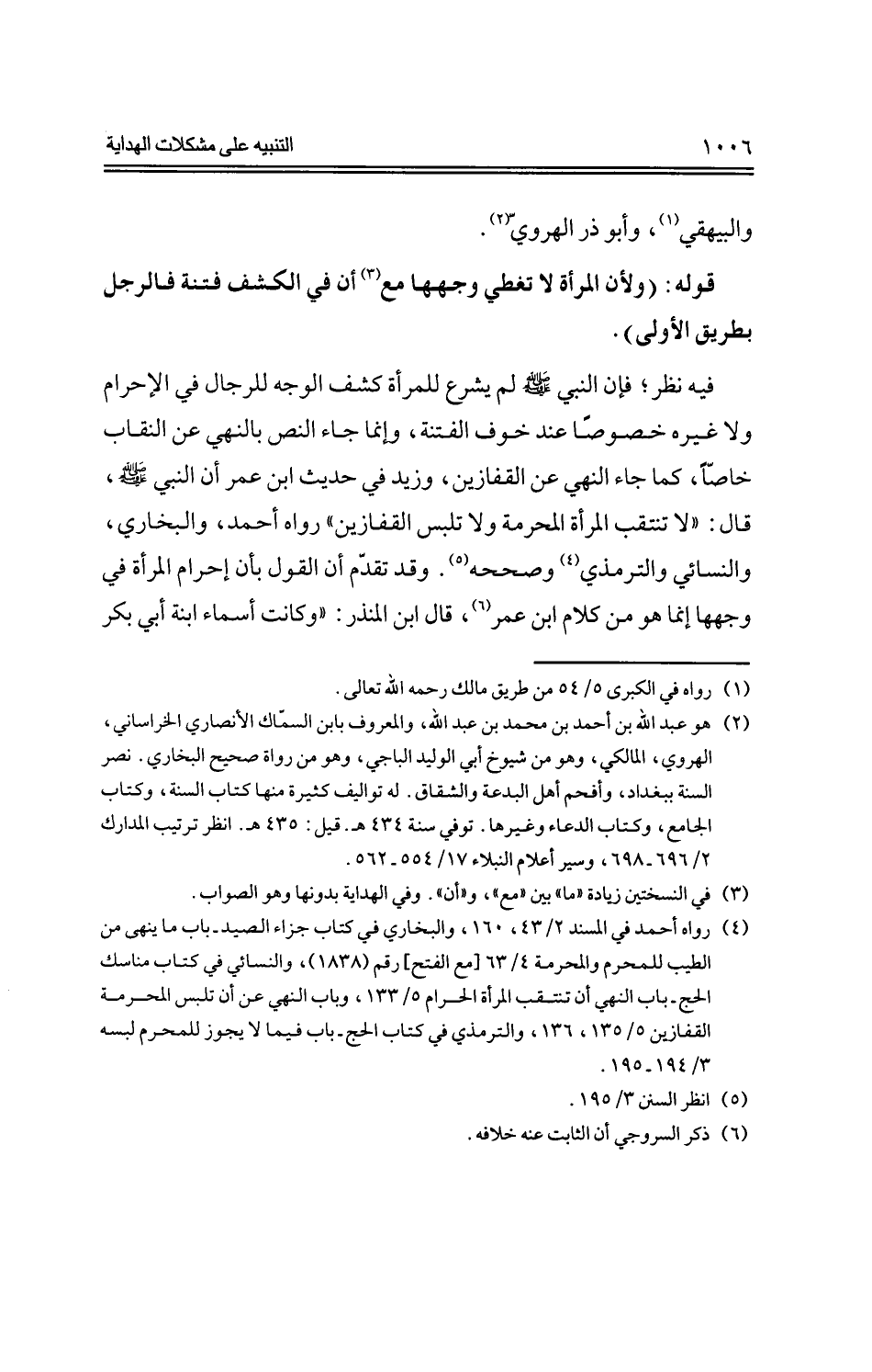 فيه نظر؛ فإن النبي --صلى الله عليه وسلم-- لم يشرع للمرأة كشف الوجه للرجال في الإحرام ولا غيره خصوصًا عند خوف الفتنة، وإنما جاء النص بالنهي عن النقاب خاصًا، كما جاء النهي عن القفازين، وزيد في حديث ابن عمر أن النبي --صلى الله عليه وسلم--، قال: "لا تنتقب المرأة المحرمة ولا تلبس القفازين" رواه أحمد، والبخاري، والنسائي والترمذي وصححه. وقد تقدم أن القول بأن إحرام المرأة في وجهها إنما هو من كلام ابن عمر، قال ابن المنذر: "وكانت أسماء ابنة أبي بكر