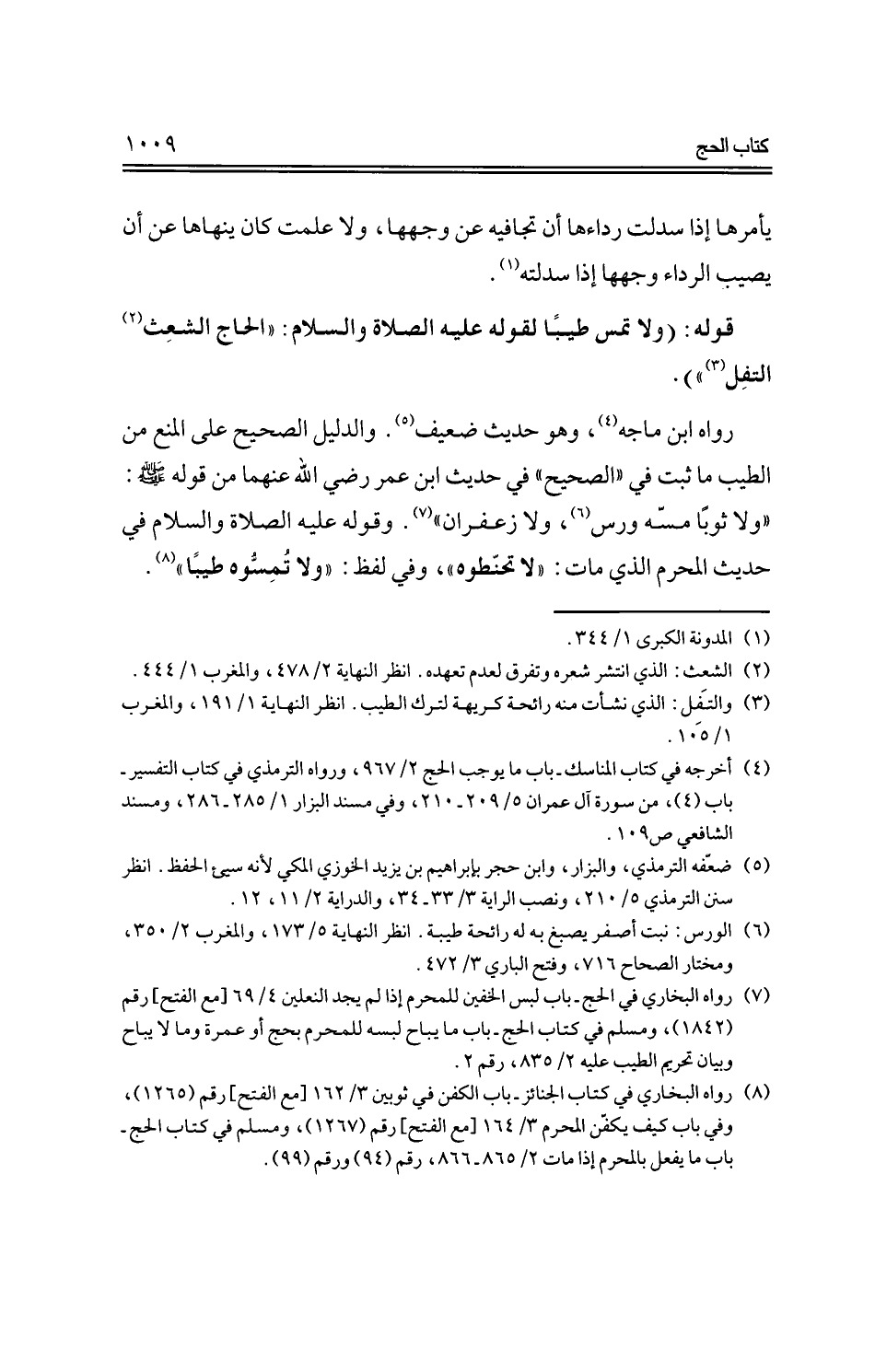 رواه ابن ماجه، وهو حديث ضعيف. والدليل الصحيح على المنع من الطيب ما ثبت في "الصحيح" في حديث ابن عمر رضي الله عنهما من قوله --صلى الله عليه وسلم--: "ولا ثوبصا مسه ورس، ولا زعفران". وقوله عليه الصلاة والسلام في حديث الحرم الذي مات: "لا تحنطوه"، وفي لفظ: "ولا تمسوه طيبًا".