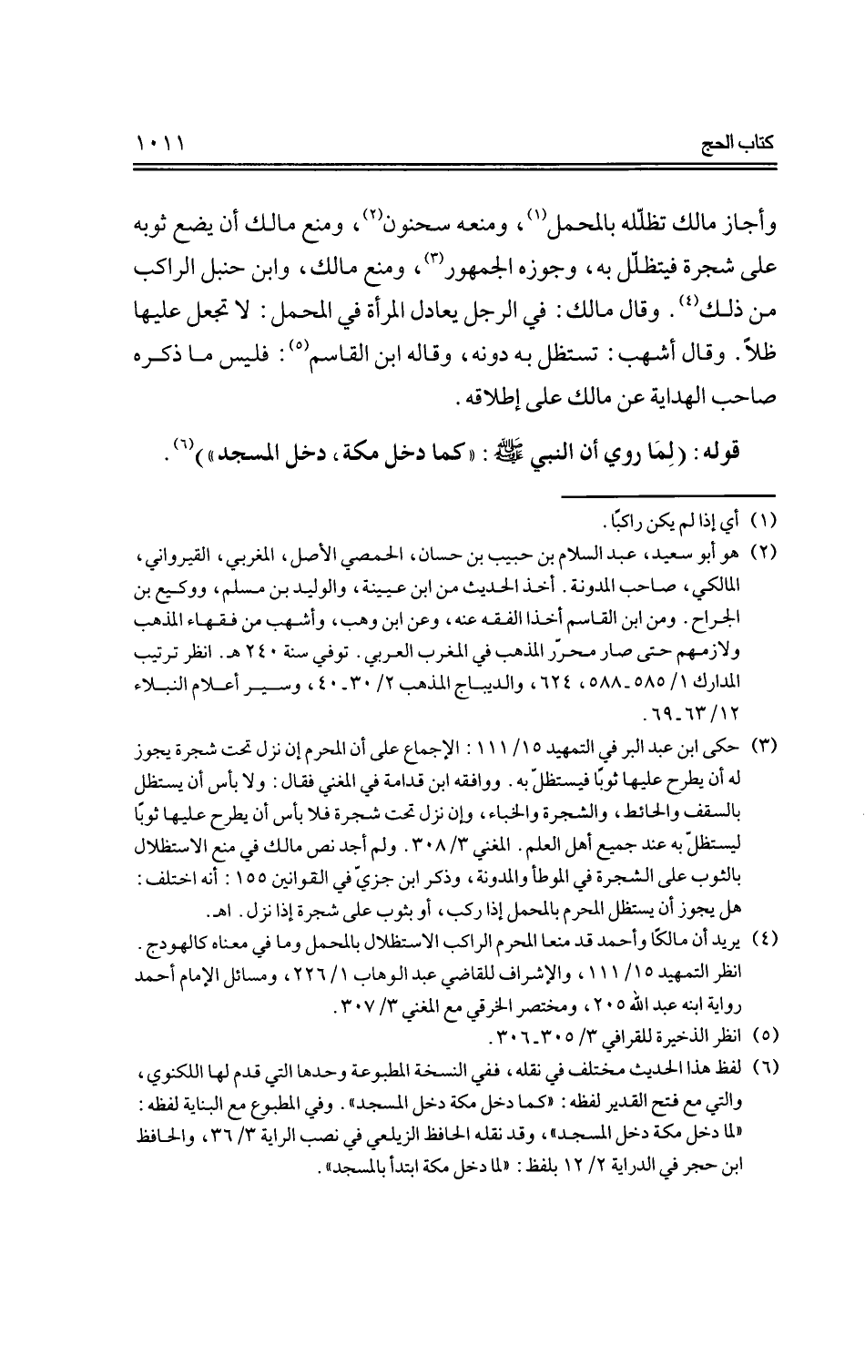 وأجاز مالك تظلله بالمحمل، ومنعه سحنون، ومنع مالك أن يضع ثوبه على شجرة فيتظلل به، وجوزه الجمهور، ومنع مالك، وابن حنبل الراكب من ذلك. وقال مالك: في الرجل يعادل المرأة في المحمل: لا تجعل عليها ظلاً. وقال أشهب: تستظل به دونه، وقاله ابن القاسم: فليس ما ذكره صاحب الهداية عن مالك على إطلاقه.
