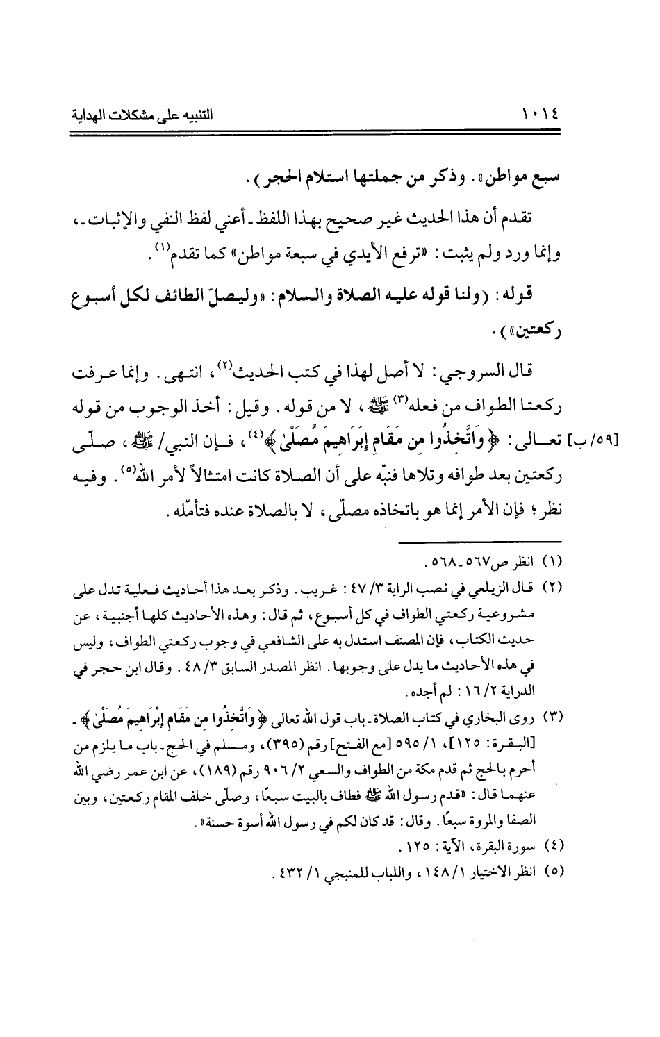 قال السروجي: لا أصل لهذا في كتب الحديث، انتهى. وإنما عرفت ركعتا الطواف من فعله --صلى الله عليه وسلم--، لا من قوله. وقيل: أخذ الوجوب من قوله تعالى: {واتخذوا من مقام إبراهيم مصلى}، فإن النبي --صلى الله عليه وسلم--، صلى ركعتين بعد طوافه وتلاها فنبه على أن الصلاة كانت امتثالاً لأمر الله. وفيه نظر؛ فإن الأمر إنما هو باتخاذه مصلى، لا بالصلاة عنده فتأمله.