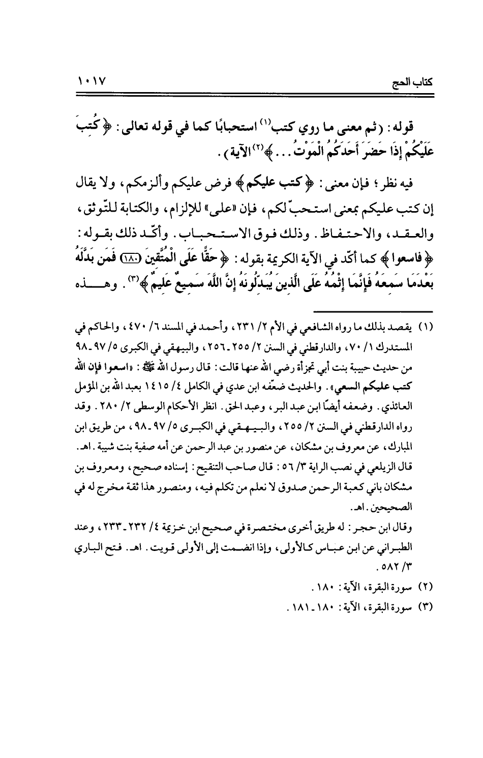فيه نظر؛ فإن معنى: {كتب عليكم} فرض عليكم وألزمكم، ولا يقال إن كتب عليكم بمنعى استحب لكم، فإن "على" للإلزام، والكتابة للتوثق، والعقد، والاحتفاظ. وذلك فوق الاستحباب. وأكد ذلك بقوله: {فاسعوا} كما أكد في الآية الكريمة بقوله: {حقًا على المتقين * فمن بدله بعدما سمعه فإنما إثمه على الذين يبدلونه إن الله سميع عليم}. وهذه