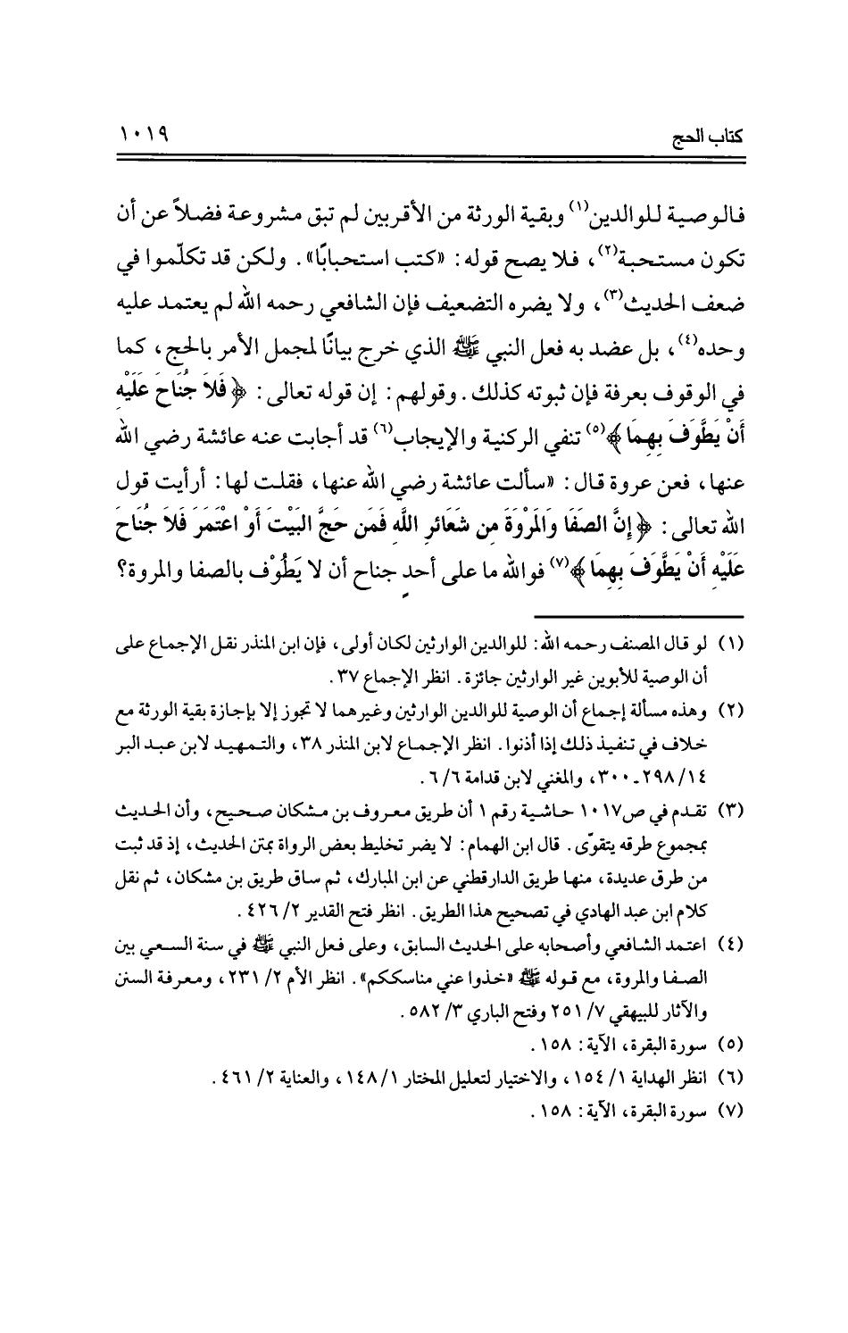 فالوصية للوالدين وبقية الورثة من الأقربين لم تبق مشروعة فضلاً عن أن تكون مستحبة، فلا يصح قوله: "كتب استحبابًا". ولكن قد تكلموا في ضعف الحديث، ولا يضره التضعيف فإن الشافعي رحمه الله لم يعتمد عليه وحده، بل عضد به فعل النبي --صلى الله عليه وسلم-- الذي خرج بيانًا لمجمل الأمر بالحج، كما في الوقوف بعرفة فإن ثبوته كذلك. وقولهم: إن قوله تعالى: {فلا جناح عليه أن يطوف بهما} تنفي الركنية والإيجاب قد أجابت عنه عائشة رضي الله عنها، فعن عروة قال: "سألت عائشة رضي الله عنها، فقلت لها: أرأيت قول الله تعالى: {إن الصفا والمروة من شعائر الله فمن حج البيت أو اعتمر فلا جناح عليه أن يطوف بهما} فوالله ما على أحد جناح أن لا يطوف بالصفا والمروة؟