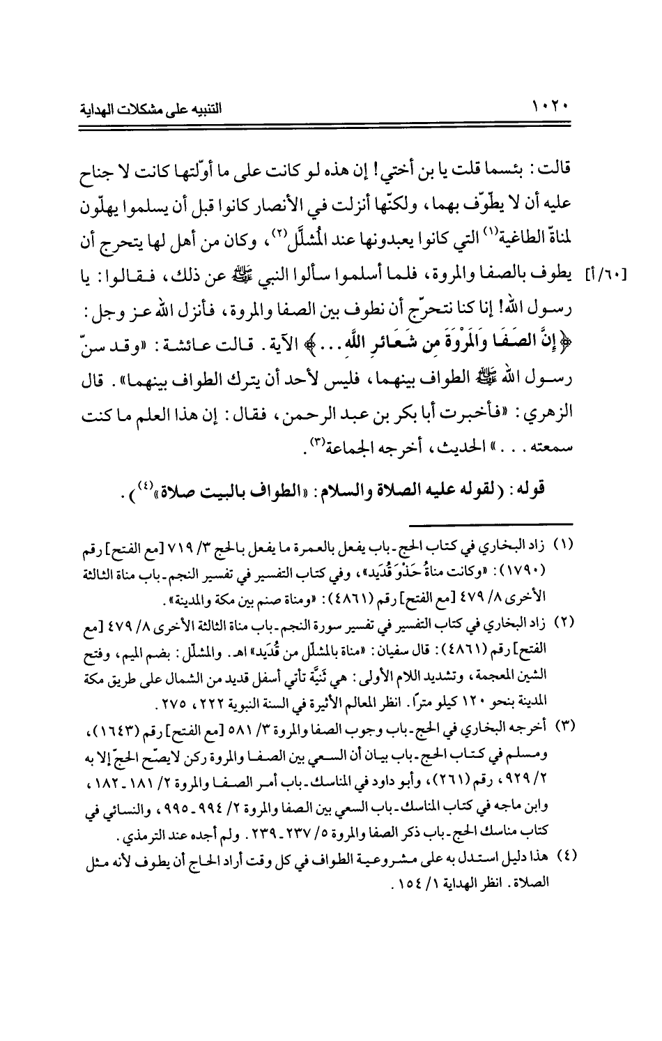 قالت: بئسما قلت يا بن أختي! إن هذه لو كانت على ما أوليتها كانت لا جناح عليه أن لا يطوف بهما، ولكنها أنزلت في الأنصار كانوا قبل أن يسلموا يهلون لمناة الطاغية التي كانواي يعبدونها عند المشلل، وكان من أهل لها يتحرج أن يطوف بالصفا والمروة، فلما أسلموا سألوا النبي --صلى الله عليه وسلم-- عن ذلك، فقالوا: يا رسول الله! إنا كنا نتحرج أن نطوف بين الصفا والمروة، فأنزل الله عز وجل: {إن الصفا والمروة من شعائر الله ...} الآية. قالت عائشة: "وقد سن رسول الله --صلى الله عليه وسلم-- الطواف بينهما، فليس لأحد أن يترك الطواف بينهما". قال الزهري: "فأخبرت أبا بكر بن عبد الرحمن، فقال: إن هذا العلم ما كنت سمعته ... " الحديث، أخرجه الجماعة.