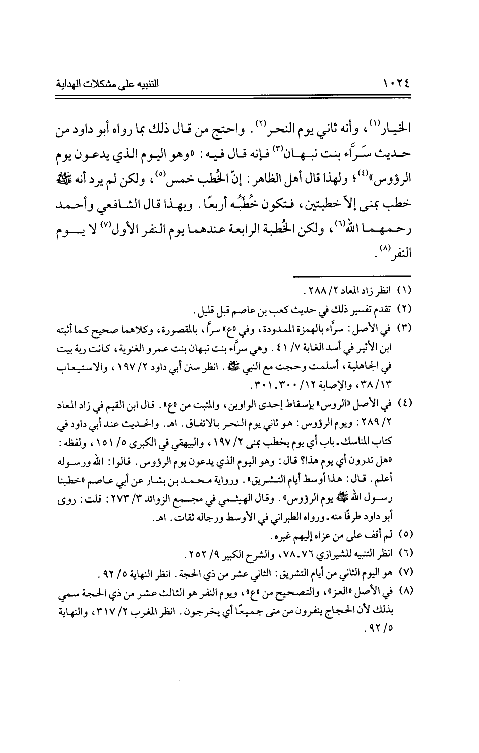 الخيار، وأنه ثاني يوم النحر. واحتج من قال ذلك بما رواه أبو داود من حديث سراء بنت نبهان فإنه قال فيه: "وهو اليوم الذي يدعون يوم الرؤوس"؛ ولهذا قال أهل الظاهر: إن الخطب خمس، ولكن لم يرد أنه --صلى الله عليه وسلم-- خطب بمنى إلا خطبتين، فتكون خطبه أربعًا. وبهذا قال الشافعي وأحمد رحمهما الله، ولكن الخطبة الرابعة عندهما يوم النفر الأول لا يوم النفر.