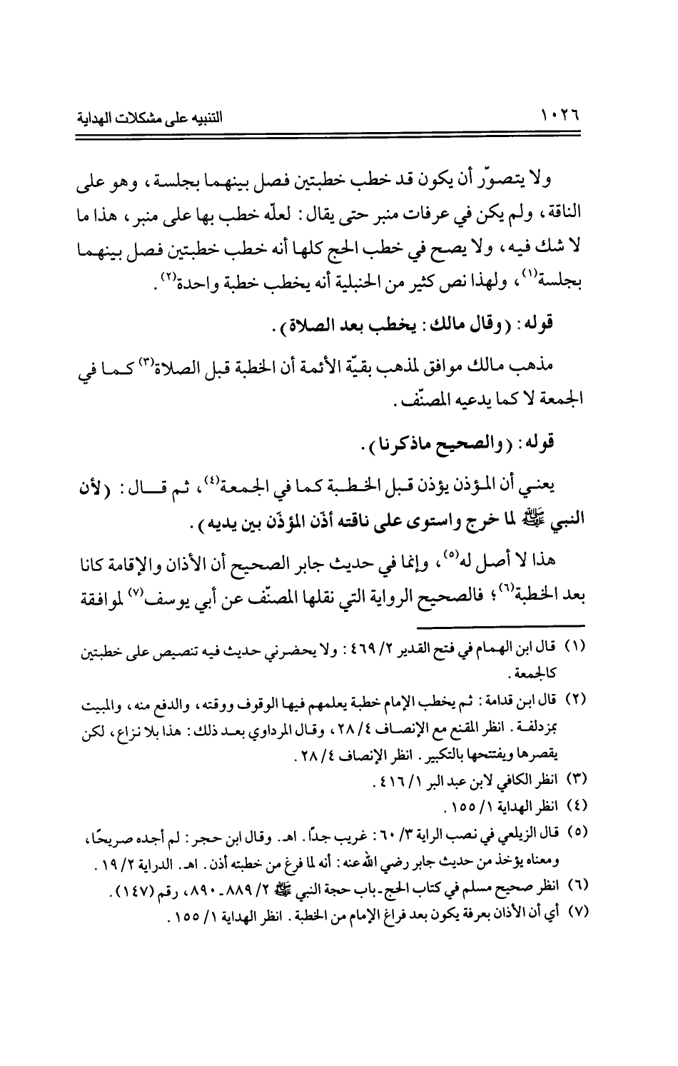 ولا يتصور أن يكون قد خطب خطبتين فصل بينهما بجلسة، وهو على الناقة، ولم يكن في عرفات منبر حتى يقال: لعله خطب بها على منبر، هذا ما لا شك فيه، ولا يصح في خطب الحج كلها أنه خطب خطبتين فصل بينهما بجلسة، ولهذا نص كثير من الحنبلية أنه يخطب خطبة واحدة.