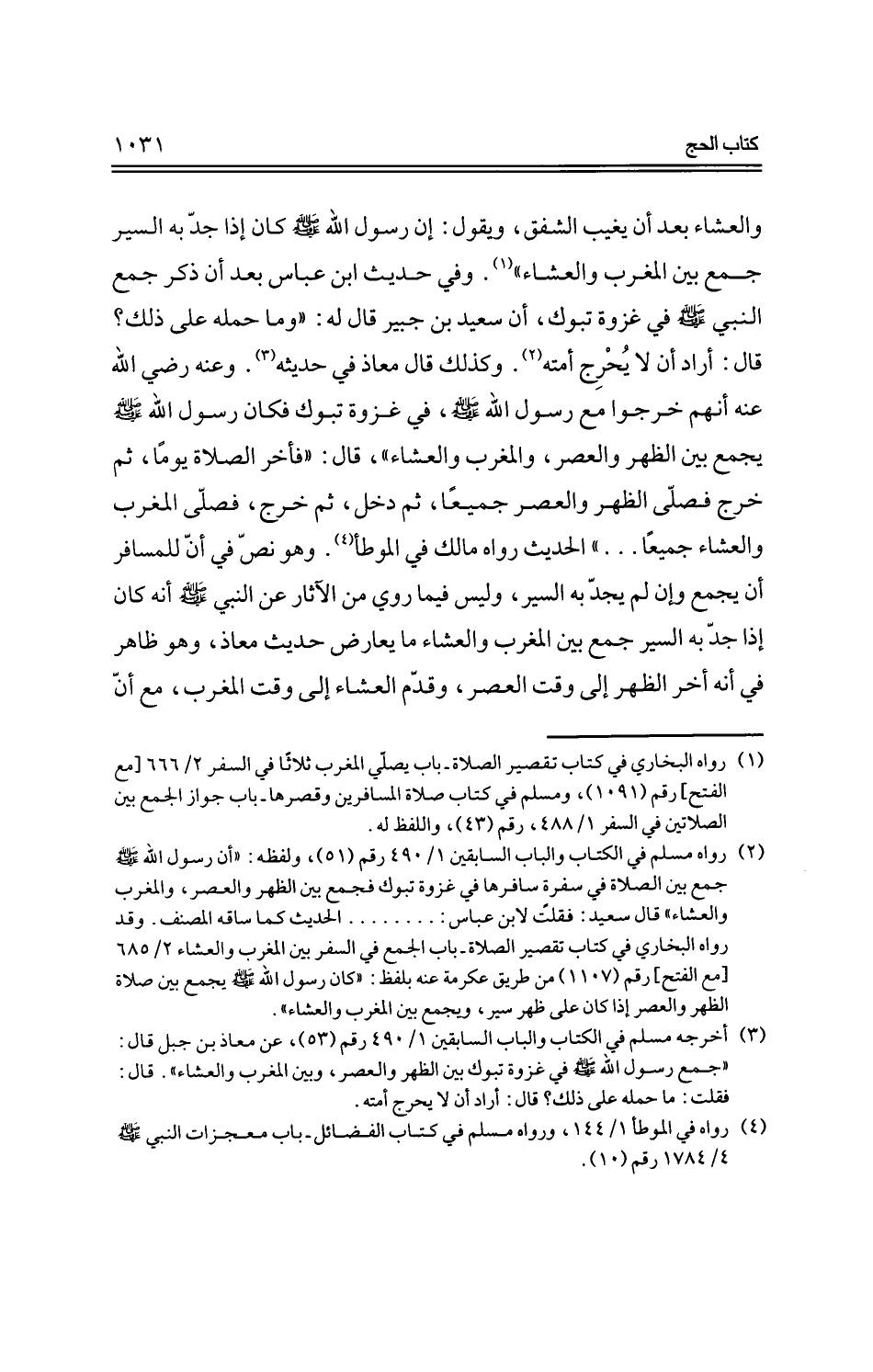 والعشاء بعد أن تغيب الشفق، ويقول: إن رسول الله --صلى الله عليه وسلم-- كان إذا جد به السير جمع بين المغرب والعشاء". وفي حديث ابن عباس بعد أن ذكر جمع النبي --صلى الله عليه وسلم-- في غزوة تبوك، أن سعيد بن جبير قال له: "وما حمله على ذلك؟ قال: أراد أن لا يحرج أمته. وكذلك قال معاذ في حديثه. وعنه رضي الله عنه أنهم خرجوا مع رسول الله --صلى الله عليه وسلم--، في غزوة تبوك فكان رسول الله --صلى الله عليه وسلم-- يجمع بين الظهر والعصر جميعًا، ثم دخل، ثم خرج، فصلى المغرب والعشاء جميعًا ... " الحديث رواه مالك في الموطأ. وهو نص في أن للمسافر أن يجمع وإن لم يجد به السير، وليس فيما يوري من الآثار عن النبي --صلى الله عليه وسلم-- أنه كان إذا جد به السير جمع بين المغرب والعشاء ما يعارض حديث معاذ، وهو ظاهر في أنه أخر الظهر إلى وقت العصر، وقدم العشاء إلى وقت المغرب، مع أن