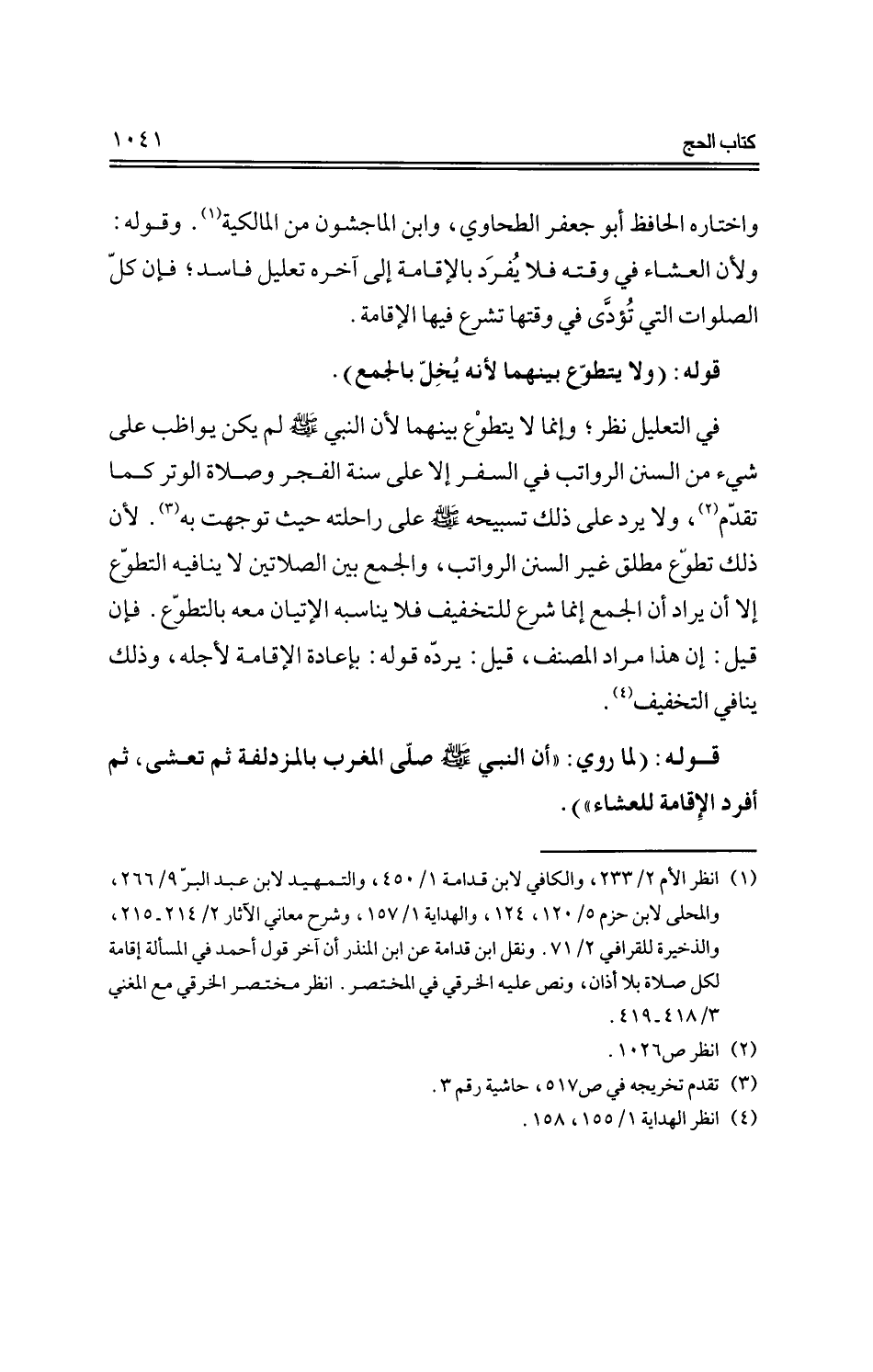 في التعليل نظر؛ وإنما لا يتطوع بينهما لأن النبي -صلى الله عليه وسلم- لم يكن يواظب على شيء من السنن الرواتب في السفر إلا على سنة الفجر وصلاة الوتر كما تقدم، ولا يرد على ذلك تسبيحه -صلى الله عليه وسلم- على راحلته حيث توجهت به. لأن ذلك تطوع مطلق غير السنن الرواتب، والجمع بين الصلاتين لا ينافيه التطوع إلا أن يراد أن الجمع إنما شرع للتخفيف فلا يناسبه الإتيان معه بالتطوع. فإن قيل: إن هذا مراد المصنف، قيل: يرده قوله: بإعادة الإقامة لأجله، وذلك ينافي التخفيف.