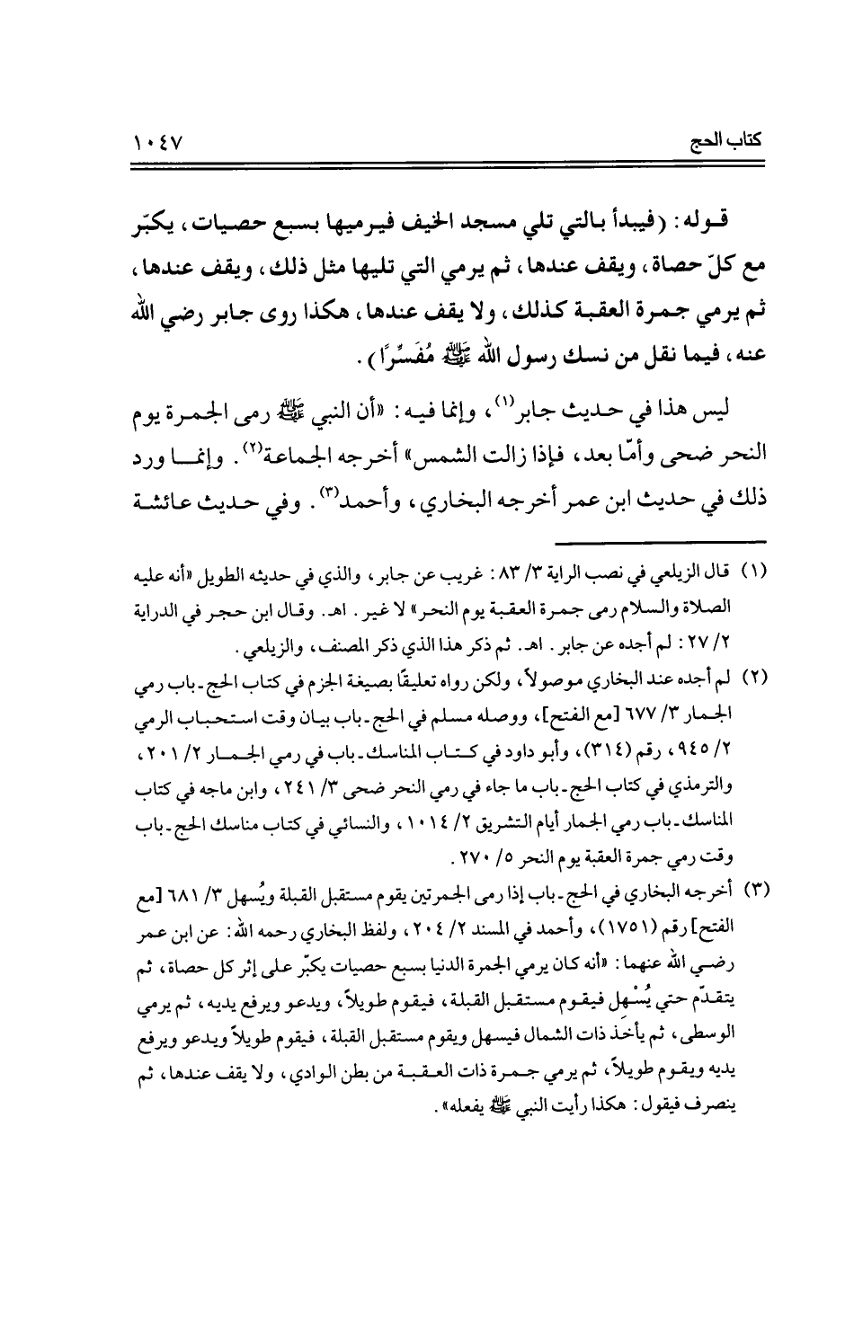 قوله: (فيبدأ بالتي تلي مسجد الخيف فيرميها بسبع حصيات، يكبر مع كل حصاة، ويقف عندها، ثم يرمي التي تليها مثل ذلك، ويقف عندها، ثم يرمي جمرة العقبة كذلك، ولا يقف عندها، هكذا روى جابر رضي الله عنه، فيما نقل من نسك رسول الله -صلى الله عليه وسلم- مفسرًا).