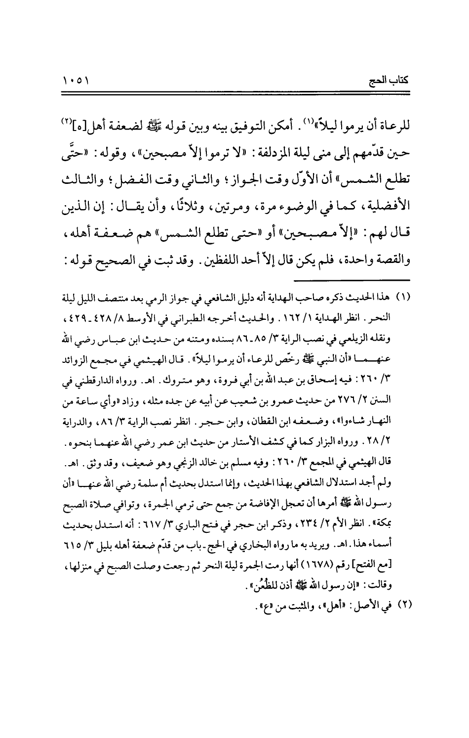 للرعاة أن يرموا ليلاً". أمكن التوفيق بينه وبين قوله -صلى الله عليه وسلم- لضعفة أهل [هـ] حين قدمهم إلى منى ليلة المزدلفة: "لا ترموا مصبحين"، وقوله: "حتى تطلع الشمس" أن الأول وقت الجواز؛ والثاني وقت الفضل؛ والثالث الأفضلية، كما في الوضوء مرة، ومرتين، وثلاثًا، وأن يقال: إن الذين قال لهم: "إلا مصبحين" أو "حتى تطلع الشمس" هم ضعفة أهله، والقصة واحدة، فلم يكن قال إلا أحد اللفظين. وقد ثبت في الصحيح قوله: