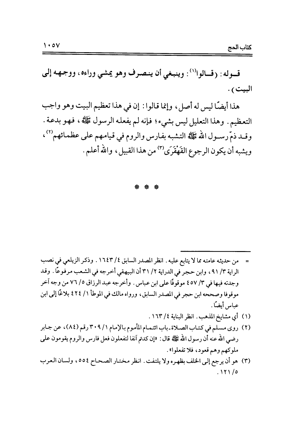 قوله: (قالوا: وينبغي أن ينصرف وهو يمشي وراءه، ووجهه إلى البيت).