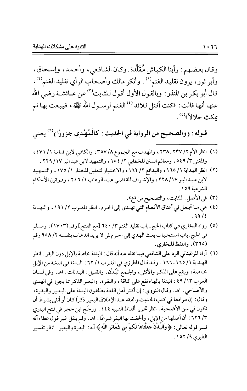 وقال بعضهم: رأينا الكباش مقلدة. وكان الشافعي، وأحمد، وإسحاق، وأبو ثور، يرون تقليد الغنم. وأنكر مالك وأصحاب الرأي تقليد الغنم، قال أبو بكر بن المنذر: وبالقول الأول أقول للثابت عن عائشة رضي الله عنها أنها قالت: "كنت أفتل قلائد الغنم لرسول الله -صلى الله عليه وسلم-، فيبعث بها ثم يمكث حلالاً".