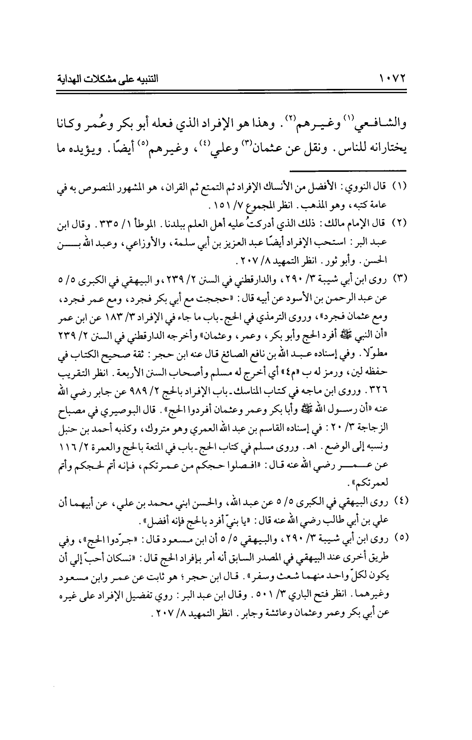 والشافعي وغيرهم. وهذا هو الإفراد الذي فعله أبو بكر وعمر وكانا يختارانه للناس. ونقل عن عثمان وعلي، وغيرهم أيضًا. ويؤيده ما