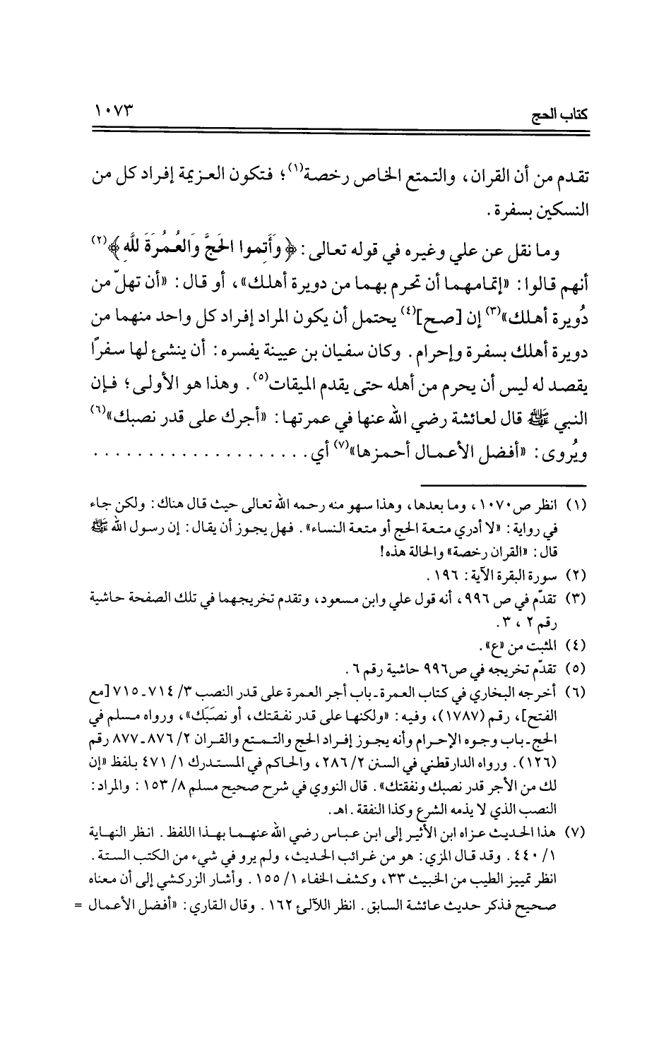 وما نقل عن علي وغيره في قوله تعالى: {وأتموا الحج والعمرة لله} أنهم قالوا: "إتمامهما أن تحرم بهما من دويرة أهلك"، أو قال: "أن تهل من دويرة أهلك" إن [صح] يحتمل أن يكون المراد إفراد كل واحد منهما من دويرة أهلك بسفرة وإحرام. وكان سفيان بن عيينة يفسره: أن ينشئ لها سفرًا يقصد له ليس أن يحرم من أهله حتى يقدم الميقات. وهذا هو الأولى؛ فإن النبي -صلى الله عليه وسلم- قال لعائشة رضي الله عنها في عمرتها: "أجرك على قدر نصبك" ويروى: "أفضل الأعمال أحمزها" أي ...................................