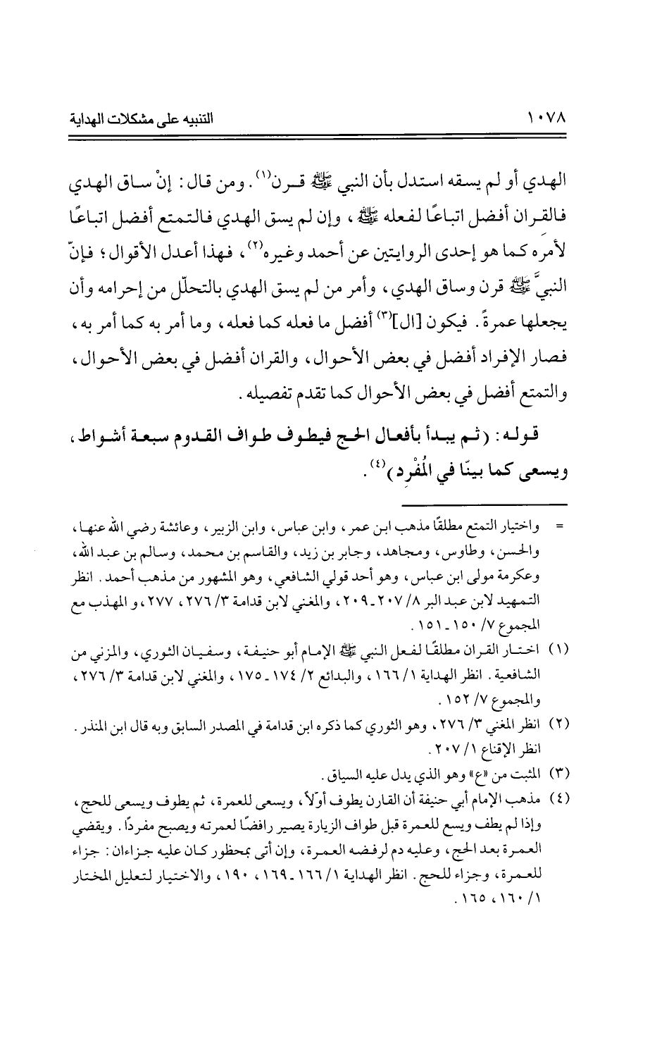 الهدي أو لم يسقه استدل بأن النبي -صلى الله عليه وسلم- قرن. ومن قال: إن ساق الهدي فالقران أفضل اتباعًا لفعله -صلى الله عليه وسلم-، وإن لم يسق الهدي فالتمتع أفضل اتباعًا لأمره كما هو إحدى الروايتين عن أحمد وغيره، فهذا أعدل الأقوال؛ فإن النبي -صلى الله عليه وسلم- قرن وساق الهدي، وأمر من لم يسق الهدي بالتحلل من إحرامه وأن يجعلها عمرة. فيكون [ال] أفضل ما فعله كما فعله، وما أمر به كما أمر به، فصار الإفراد أفضل في بعض الأحوال، والقران أفضل في بعض الأحوال، والتمتع أفضل في بعض الأحوال كما تقدم تفصيله.