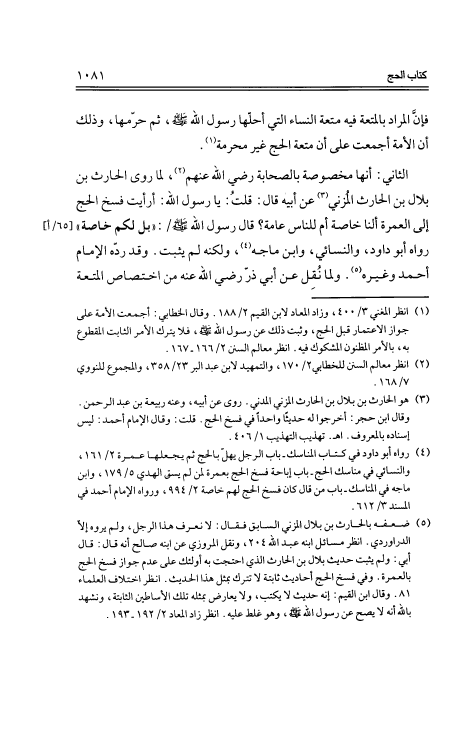 الثاني: أنها مخصوصة بالصحابة رضي الله عنهم، لما روى الحارث بن بلال بن الحارث المزني عن أبيه قال: قلت: يا رسول الله: أرأيت فسخ الحج إلى العمرة ألنا خاصةً أم للناس عامةً؟ قال رسول الله- صلى الله عليه وسلم-: "بل لكم خاصةً" رواه أبو داود، والنسائي، وابن ماجة، ولكنه لم يثبت. وقد رده الإمام أحمد وغيره. ولما نقل عن أبي ذر رضي الله عنه من اختصاص المتعة
