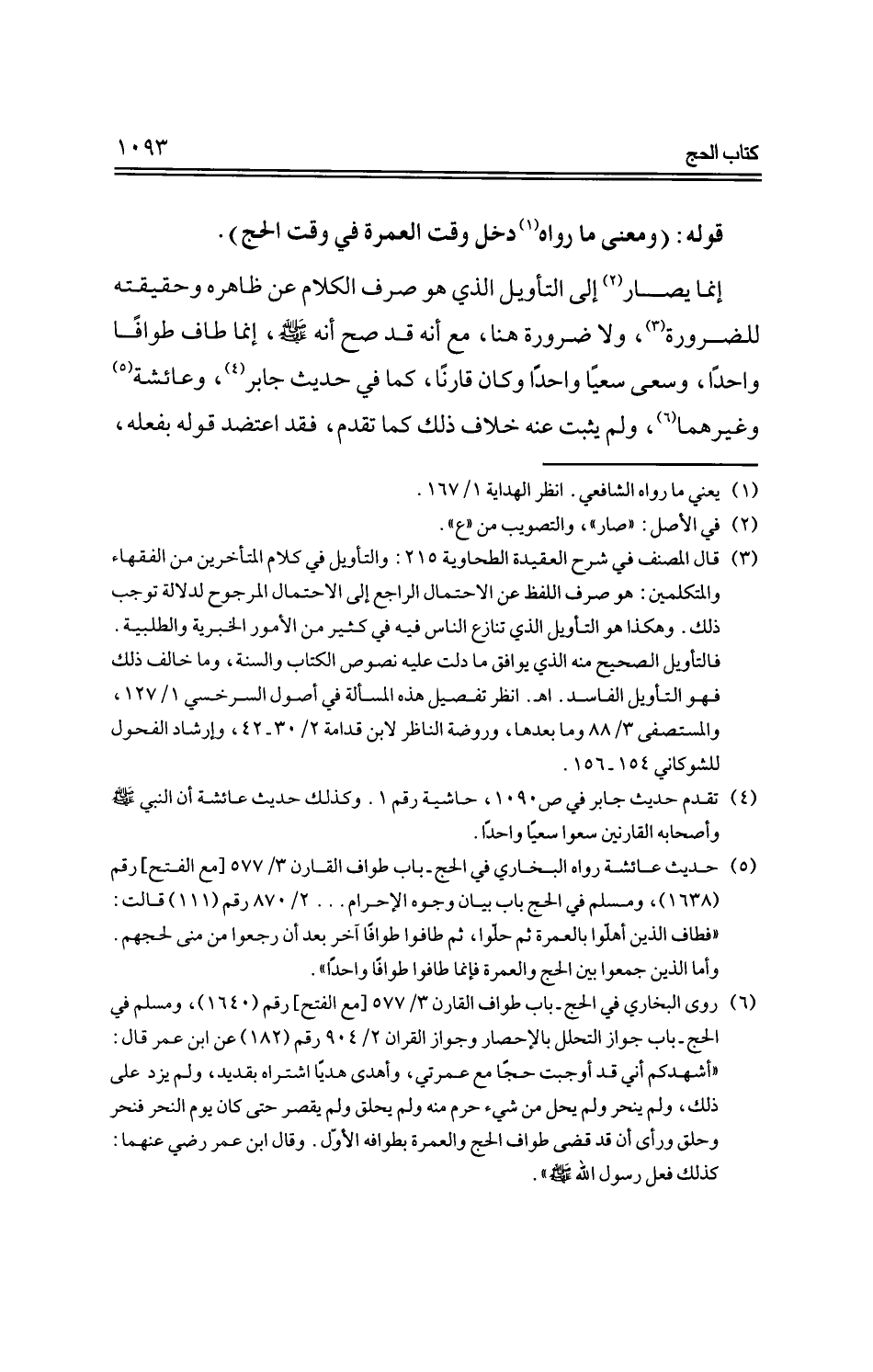 إنما يصار إلى التأويل الذي هو صرف الكلام عن ظاهره وحقيقته للضرورة، ولا ضرورة هنا، مع أنه قد صح أنه- صلى الله عليه وسلم-، إنما طاف طوافًا واحدًا، سعي سعيًا واحدًا وكان قارنًا، كما في حديث جابر، وعائشة وغيرهما، ولم يثبت عنه خلاف ذلك كما تقدم، فقد اعتضد قوله بفعله،