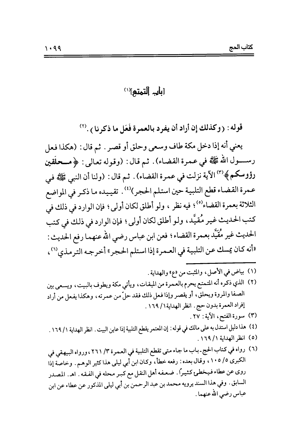 يعني أنه إذا دخل مكة طاف وسعى وحلق أو قصر. ثم قال: (هكذا فعل رسول الله- صلى الله عليه وسلم- في عمرة القضاء). ثم قال: (وقوله تعالى: {محلقين رؤوسكم} الآية نزلت في عمرة القضاء). ثم قال: (ولنا أنا النبي- صلى الله عليه وسلم- في عمرة القضاء قطع التلبية حين استلم الحجر). تقييده ما ذكر في المواضع الثلاثة بعمرة القضاء؛ فيه نظر، ولو أطلق لكان أولى؛ فإن الوارد في ذلك في كتب الحديث غير مقيد، ولو أطلق لكان أولى؛ فإن الوارد في ذلك في كتب الحديث غير مقيد بعمرة القضاء؛ فعن ابن عباس رضي الله عنهما رفع الحديث: "أنه كان يمسك عن التلبية في العمرة إذا استلم الحجر" أخرجه الترمذي،