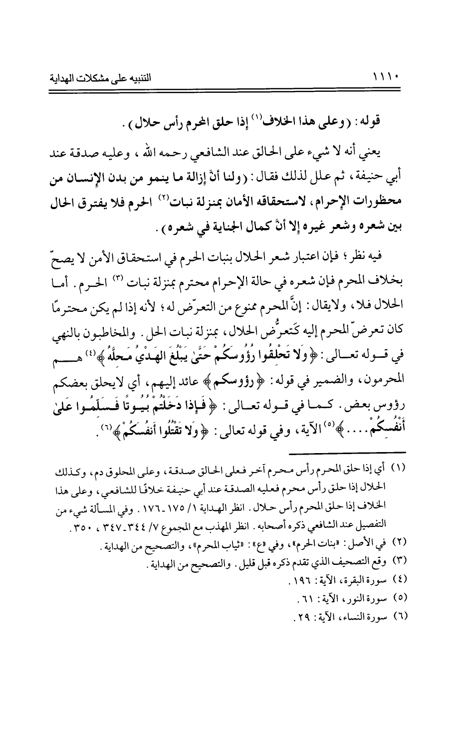 فيه نظر؛ فإن اعتبار شعر الحلال بنبات الحرم في استحقاق الأمن لا يصح بخلاف المحرم فإن شعره في حالة الإحرام محترم بمنزلة نبات الحرم. أما الحلال فلا، ولا يقال: إن المحرم ممنوع من التعرض له؛ لأنه إذا لم يكن محترمًا كان تعرض المحرم إليه كتعرض الحلال، بمنزلة نبات الحل. والمخاطبون بالنهي في قوله تعالى: {ولا تحلقوا رؤوسكم حتى يبلغ الهدي محله} هم المحرمون، والضمير في قوله: {رؤوسكم} عائد إليهم، أي لا يحلق بعضكم رؤوس بعض. كما في قوله تعالى: {فإذا دخلتم بيوتًا فسلموا على أنفسكم ....} الآية، وفي قوله تعالى: {ولا تقتلوا أنفسكم}.