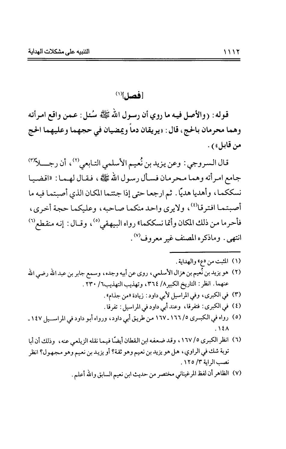 قال السروجي: وعن يزيد بن نعيم الأسلمي التابعي، أن رجلًا جامع امرأته وهما محرمان فسأل رسول الله- صلى الله عليه وسلم-، فقال لهما: "اقضيا نسككما، وأهديا هديًا. ثم ارجعا حتى إذا جئتما المكان الذي أصبتما فيه ما أصبتما افترقا، ولا يرى واحد منكما صاحبه، وعليكما حجة أخرى، فأحرما من ذلك المكان وأتما نسككما" رواه البيهقي، وقال: إنه منقطع انتهى. وما ذكره المصنف غير معروف.