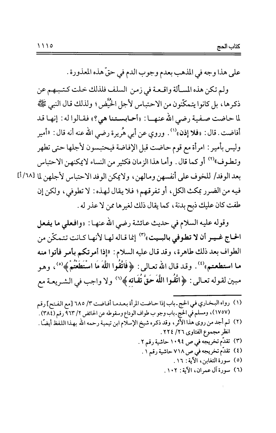 ولم تكن هذه المسألة واقعة في زمن السلف فلذلك خلت كتبهم عن ذكرها، بل كانوا يتمكَّنون من الاحتباس لأجل الحيض؛ ولذلك قال النبي- صلى الله عليه وسلم- لما حاضت صفية رضي الله عنها: "أحابستنا هي؟ " فقالوا له: إنها قد أفاضت. قال: "فلا إذن". وروي عن أبي هُريرة رضي الله عنه أنه قال: "أمير وليس بأمير: امرأة مع قومٍ حاضت قبل الإفاضة فيحتسبون لأجلها حتى تطهر وتطوف" أو كما قال. وأما هذا الزمان فكثير من النساء لا يمكنهن الاحتباس بعد الوفد/ للخوف على أنفسهن ومالهن، ولا يمكن الوفد الاحتباس لأجلهن لما فيه من الضرر بمكث الكل، أو تفرقهم؛ فلا يقال لهذه: لا تطوفي، ولكن إن طفت كان عليك ذبح بدنة، كما يقال ذلك لغيرها ممن لا عذر له.