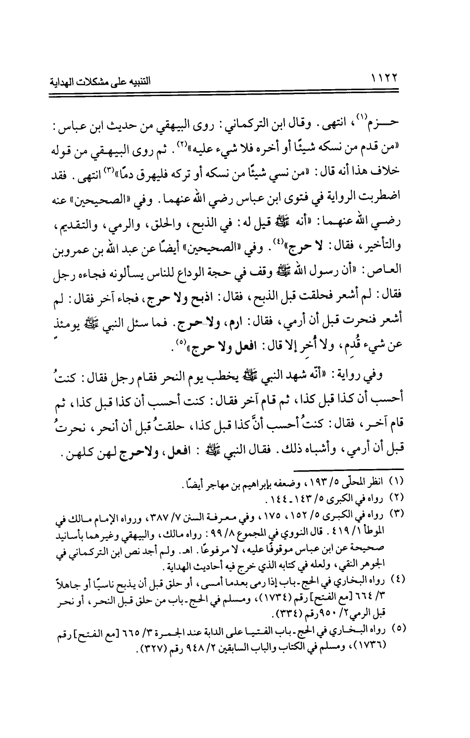 حزم، انتهى. وقال ابن التركماني: روى البيهقي من حديث ابن عباس: "من قدم من نسكه شيئًا أو أخره فلا شيء عليه". ثم روى البيهقي من قوله خلاف هذا أنه قال: "من نسي شيئًا من نسكه أو تركه فليهرق دمًا" انتهى. فقد اضطربت الرواية في فتوى ابن عباس رضي الله عنهما. وفي "الصحيحين" عنه رضي الله عنهما: "أنه- صلى الله عليه وسلم- قيل له: في الذبح، والحلق، والرمي، والتقديم، والتأخير، فقال: لا حرج". وفي "الصحيحين" أيضًا عن عبد الله بن عمرو بن العاص: "أن رسول الله- صلى الله عليه وسلم- وقف في حجة الوداع للناس يسألونه فجاءه رجل فقال: لم أشعر فحلقت قبل الذبح، فقال: اذبح ولا حرج، فجاء آخر فقال: لم أشعر فنحرت قبل أن أرمي، فقال: ارم، ولا حرج. فما سئل النبي- صلى الله عليه وسلم- يومئذ عن شيءٍ قدم، ولا أخر إلا قال: افعل ولا حرج".