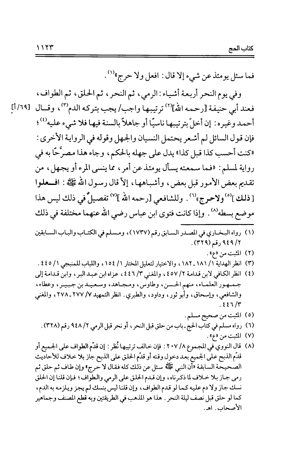 وفي يوم النحر أربعة أشياء: الرمي، ثم النحر، ثم الحلق، ثم الطواف، فعند أبي حنيفة [رحمه الله] ترتيبها واجب يجب بتركه الدم، وقال أحمد وغيره: إن أخل بترتيبها ناسيًا أو جاهلًا بالسنة فيها فلا شيء عليه؛ فإن قول السائل لم أشعر يحتمل النسيان والجهل وقوله في الرواية الأخرى: "كنت أحسب كذا قبل كذا" يدل على جهله بالحكم، وجاء هذا مصرحًا به في روايةٍ لمسلم: "فما سمعته يسأل يومئذٍ عن أمرٍ، مما ينسى المرء أو يجهل، من تقديم بعض الأمور قبل بعض، وأشباهها، إلا قال رسول الله- صلى الله عليه وسلم-: افعلوا [ذلك] ولا حرج". وللشافعي [رحمه الله] تفصيل في ذلك ليس هذا موضع بسطه. وإذا كانت فتوى ابن عباس رضي الله عنهما مختلفة في ذلك