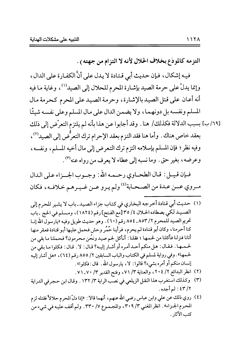فيه إشكال، فإن حديث أبي قتادة لا يدل على أن الكفارة على الدال، وإنما يدل على حرمة الصيد بإشارة المحرم للحلال إلى الصيد، وغاية ما فيه أنه أعان على قتل الصيد بالإشارة، وحرمة الصيد على المحرم كحرمة مال المسلم ونفسه بل دونهما، ولا يضمن الدال على مال المسلم وعلى نفسه شيئًا بسبب الدلالة فكذلك هنا. وقد أجابوا عن هذا بأنه لم يلتزم التعرض إلى ذلك لعقدٍ خاص هناك. وأما هنا فقد التزم بعقد الإحرام ترك التعرض إلى الصيد، وفيه نظر؛ فإن المسلم بإسلامه التزم ترك التعرض إلى مال اخيه المسلم، ونفسه، وعرضه، بغير حق. وما نسبه إلى عطاء لا يعرف من رواه عنه.
