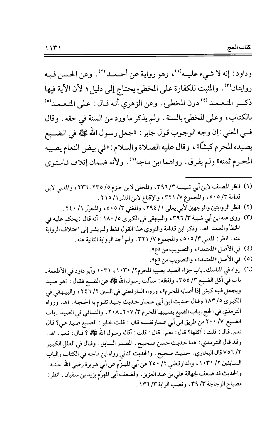 وداود: إنه لا شيء عليه، وهو رواية عن أحمد. وعن الحسن فيه روايتان. والمثبت للكفارة على المخطئ يحتاج إلى دليل؛ لأن الآية فيها ذكر المعتمد دون المخطئ. وعن الزهري أنه قال: على المعتمد بالكتاب، وعلى المخطئ بالسنة. ولم يذكر ما ورد من السنة في حقه. وقال في المغني: إن وجه الوجوب قول جابر: "جعل رسول الله- صلى الله عليه وسلم- في الضبع يصيده المحرم كبشًا"، وقال عليه الصلاة والسلام: "في بيض النعام يصيبه المحرم ثمنه" ولم يفرق. رواها ابن ماجه. ولأنه ضمان إتلافٍ فاستوى