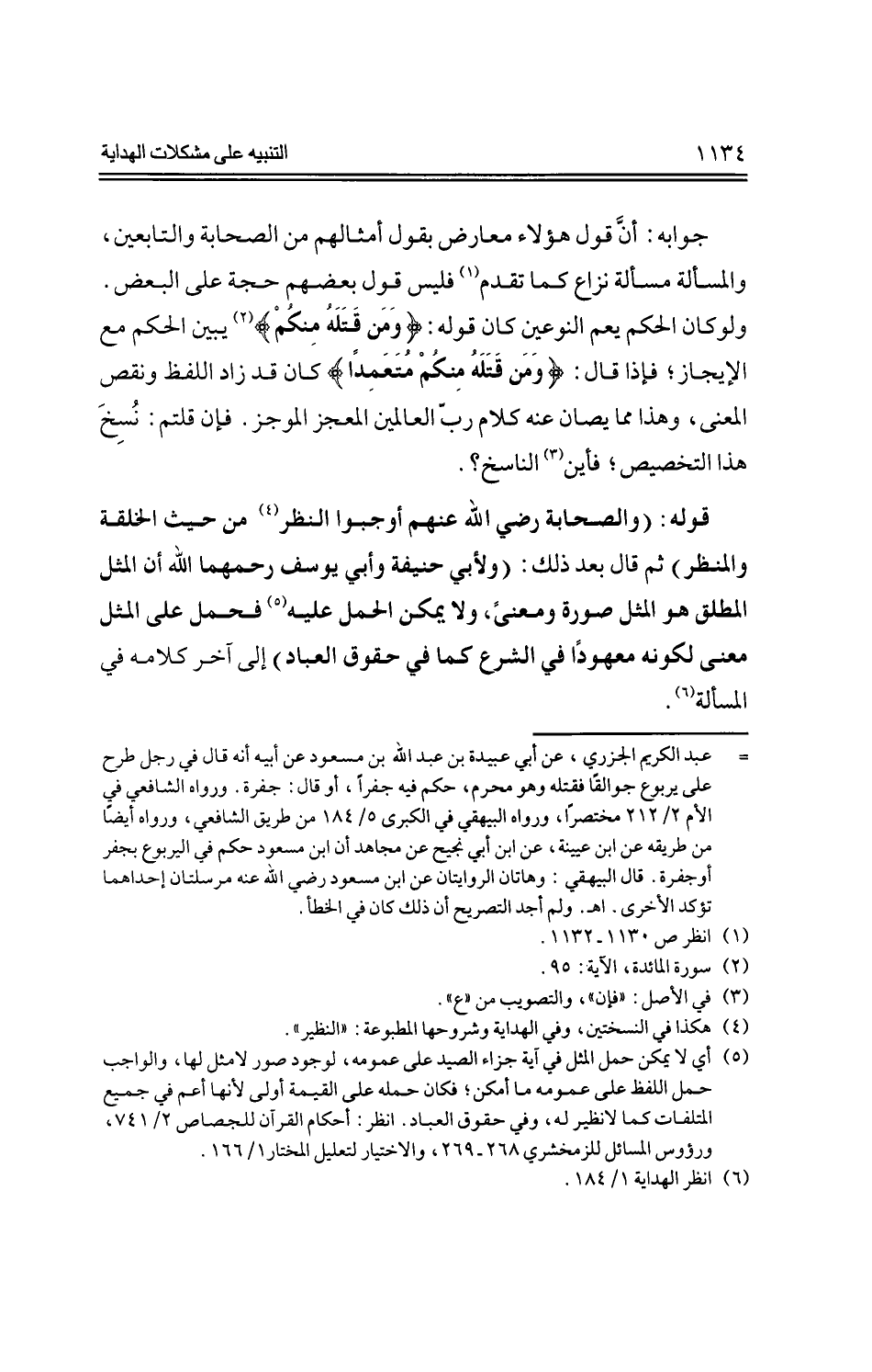 قوله: (والصحابة رضي الله عنهم أوجبوا النظر من حيث الخلقة والمنظر) ثم قال بعد ذلك: ولأبي حنيفة وأبي يوسف رحمهما الله أن المثل المطلق هو المثل صورة ومعنى، ولا يمكن الحمل عليه فحمل على المثل معنى لكونه معهودًا في الشرع كما في حقوق العباد) إلى آخر كلامه في المسألة.