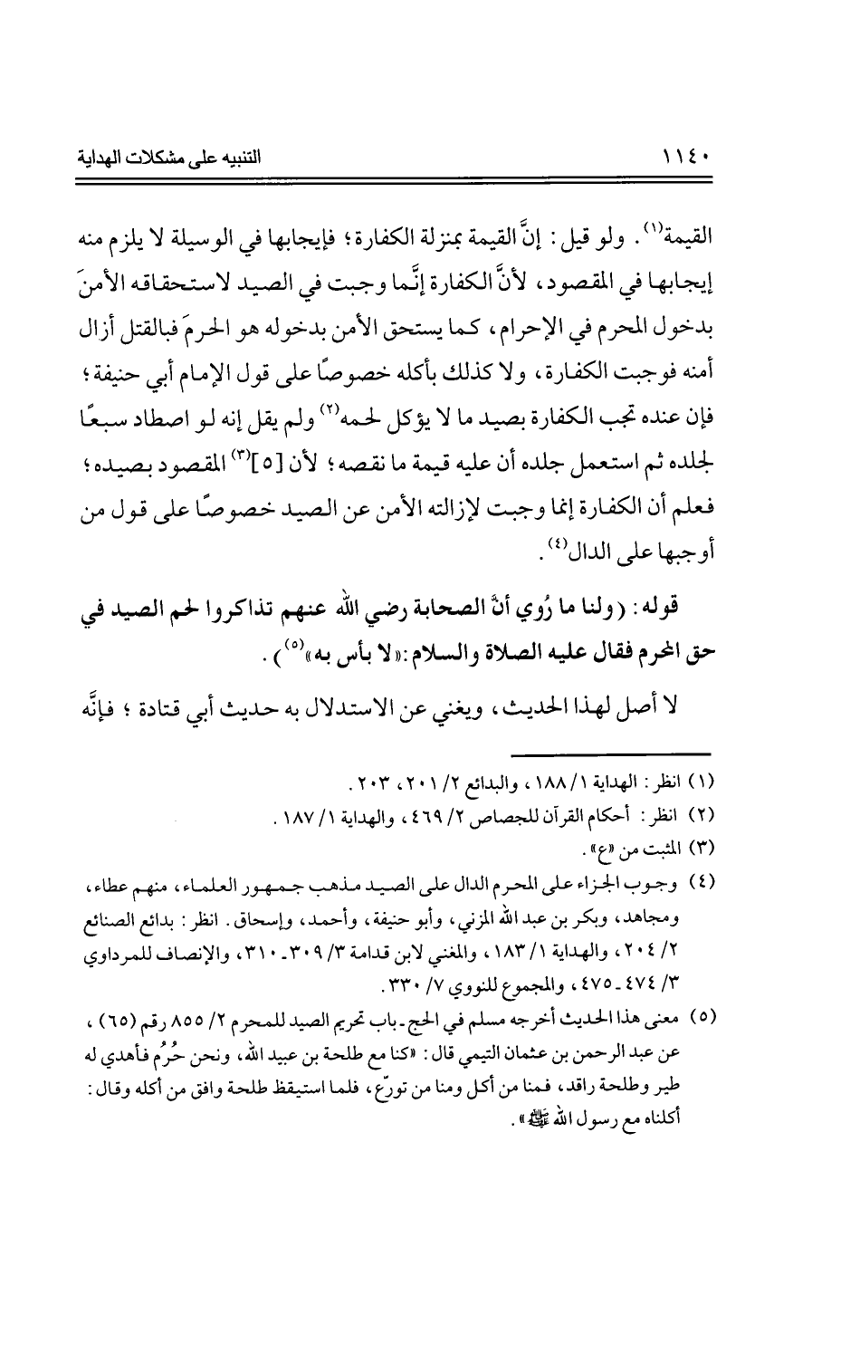 القيمة. ولو قيل: إن القيمة بمنزلة الكفارة؛ فإيجابها في الوسيلة لا يلزم منه إيجابها في المقصود، لأن الكفارة إنما وجبت في الصيد لاستحقاقه الأمن بدخول المحرم في الإحرام، كما يستحق الأمن بدخوله هو الحرم فبالقتل أزال أمنه فوجبت الكفارة، ولا كذلك بأكله خصوصًا على قول الإمام أبي حنيفة؛ فإن عنده وجب الكفارة بصيد ما لا يؤكل لحمه ولم يقل إنه لو اصطاد سبعًا لجلده ثم استعمل جلده أن عليه قيمة ما نقصه؛ لأن المقصود بصيده؛ فعلم أن الكفارة إنما وجبت لإزالته الأمن عن الصيد خصوصًا على قول من أوجبها على الدال.
