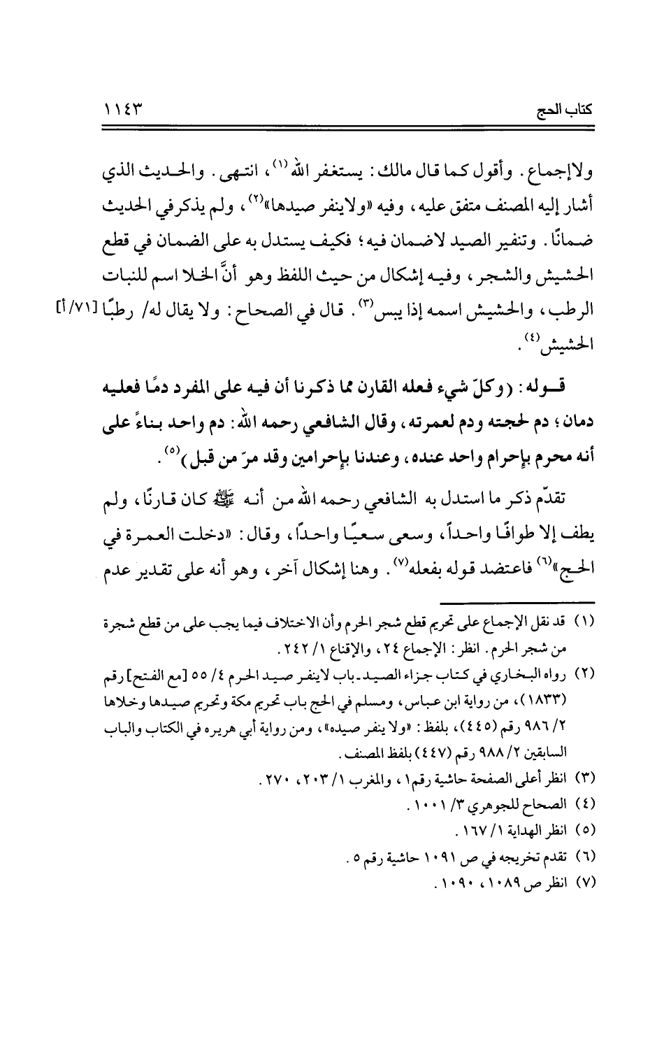 ولا إجماع. وأقول كما قال مالك: يستغفر الله، انتهى. والحديث الذي أشار إليه المصنف متفق عليه، وفيه "ولا ينفر صيدها"، ولم يذكر في الحديث ضمانًا. وتنفير الصيد لا ضمان فيه؛ فكيف يستدل به على الضمان في قطع الحشيش والشجر، وفيه إشكال من حيث اللفظ وهو أن الخلا اسم للنبات الرطب، والحشيش اسمه إذا يبس. قال في الصحاح: ولا يقال له رطبًا الحشيش.