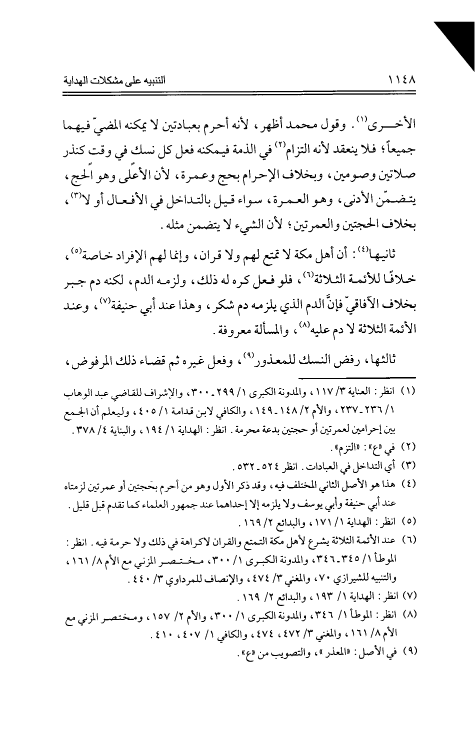 الأخرى. وقول محمد أظهر، لأنه أحرم بعبادتين لا يمكنه المضي فيهما جميعًا؛ فلا ينعقد لأنه التزام في الذمة فيمكنه فعل كل نسك في وقت كنذر صلاتين وصومين، بخلاف الإحرام بحجٍ وعمرة، لأن الأعلى وهو الحج، يتضمن الأدنى، وهو العمرة، سواء قيل بالتداخل في الأفعال أو لا، بخلاف الحجتين والعمرتين؛ لأن الشيء لا يتضمن مثله.